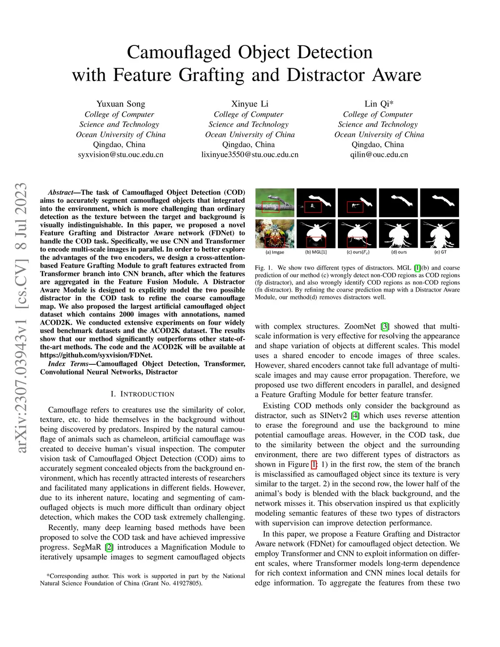 The task of Camouflaged Object Detection (COD) aims to accurately segment camouflaged objects that integrated into the environment, which is more challenging than ordinary detection as the texture between the target and background is visually indistinguishable. In this paper, we proposed a novel Feature Grafting and Distractor Aware network (FDNet) to handle the COD task. Specifically, we use CNN and Transformer to encode multi-scale images in parallel. In order to better explore the advantages of the two encoders, we design a cross-attention-based Feature Grafting Module to graft features extracted from Transformer branch into CNN branch, after which the features are aggregated in the Feature Fusion Module. A Distractor Aware Module is designed to explicitly model the two possible distractors in the COD task to refine the coarse camouflage map. We also proposed the largest artificial camouflaged object dataset which contains 2000 images with annotations, named ACOD2K. We conducted extensive experiments on four widely used benchmark datasets and the ACOD2K dataset. The results show that our method significantly outperforms other state-of-the-art methods. The code and the ACOD2K will be available at https://github.com/syxvision/FDNet.