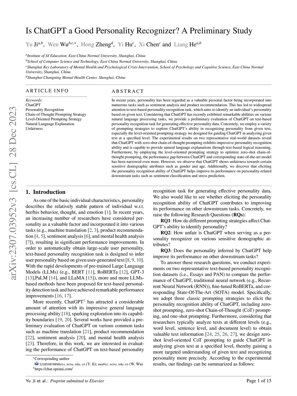 In recent years, personality has been regarded as a valuable personal factor being incorporated into numerous tasks such as sentiment analysis and product recommendation. This has led to widespread attention to text-based personality recognition task, which aims to identify an individual's personality based on given text. Considering that ChatGPT has recently exhibited remarkable abilities on various natural language processing tasks, we provide a preliminary evaluation of ChatGPT on text-based personality recognition task for generating effective personality data. Concretely, we employ a variety of prompting strategies to explore ChatGPT's ability in recognizing personality from given text, especially the level-oriented prompting strategy we designed for guiding ChatGPT in analyzing given text at a specified level. The experimental results on two representative real-world datasets reveal that ChatGPT with zero-shot chain-of-thought prompting exhibits impressive personality recognition ability and is capable to provide natural language explanations through text-based logical reasoning. Furthermore, by employing the level-oriented prompting strategy to optimize zero-shot chain-of-thought prompting, the performance gap between ChatGPT and corresponding state-of-the-art model has been narrowed even more. However, we observe that ChatGPT shows unfairness towards certain sensitive demographic attributes such as gender and age. Additionally, we discover that eliciting the personality recognition ability of ChatGPT helps improve its performance on personality-related downstream tasks such as sentiment classification and stress prediction.