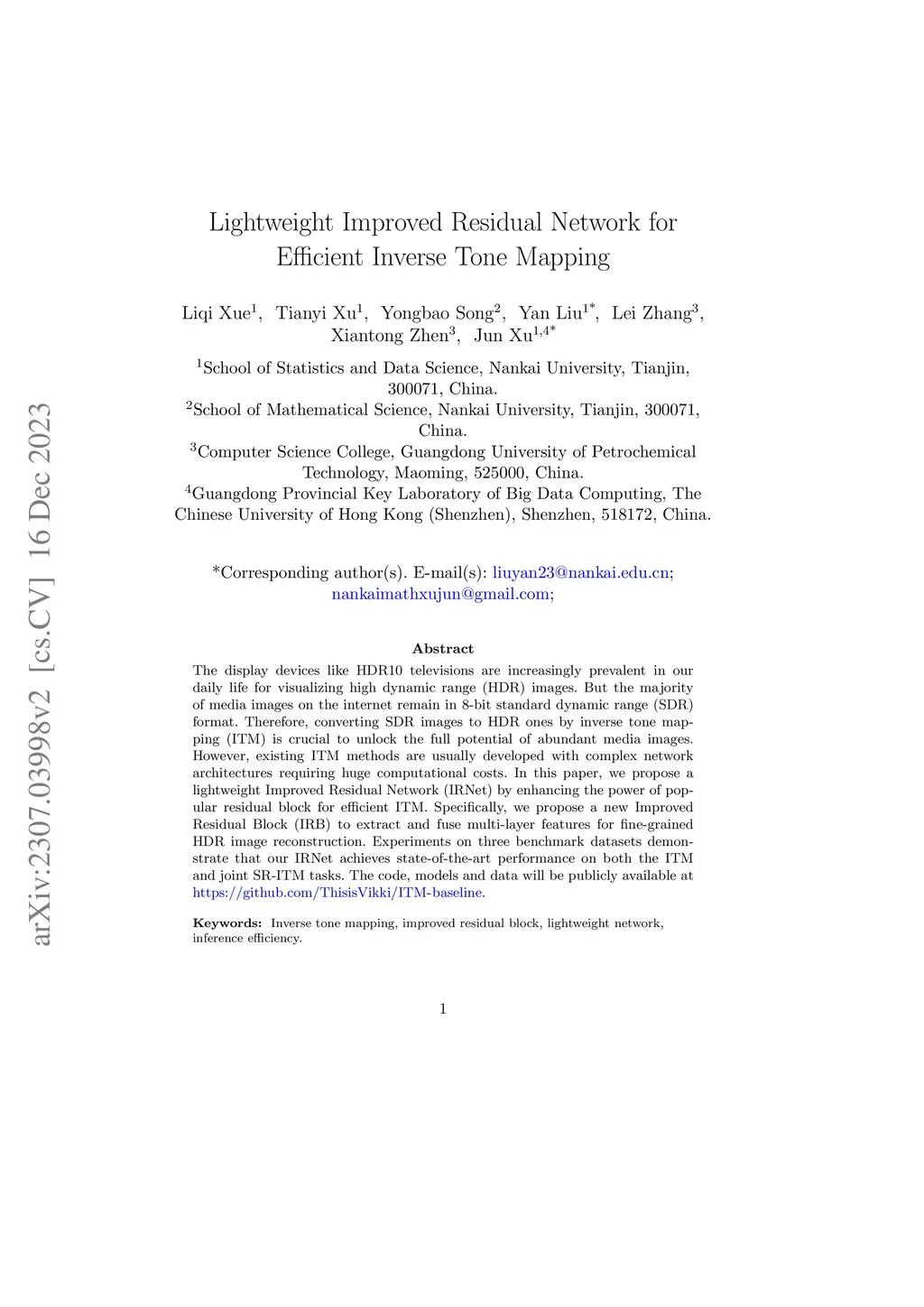 Lightweight Improved Residual Network for Efficient Inverse Tone Mapping