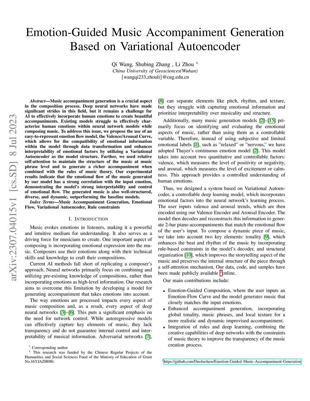 Music accompaniment generation is a crucial aspect in the composition process. Deep neural networks have made significant strides in this field, but it remains a challenge for AI to effectively incorporate human emotions to create beautiful accompaniments. Existing models struggle to effectively characterize human emotions within neural network models while composing music. To address this issue, we propose the use of an easy-to-represent emotion flow model, the Valence/Arousal Curve, which allows for the compatibility of emotional information within the model through data transformation and enhances interpretability of emotional factors by utilizing a Variational Autoencoder as the model structure. Further, we used relative self-attention to maintain the structure of the music at music phrase level and to generate a richer accompaniment when combined with the rules of music theory.