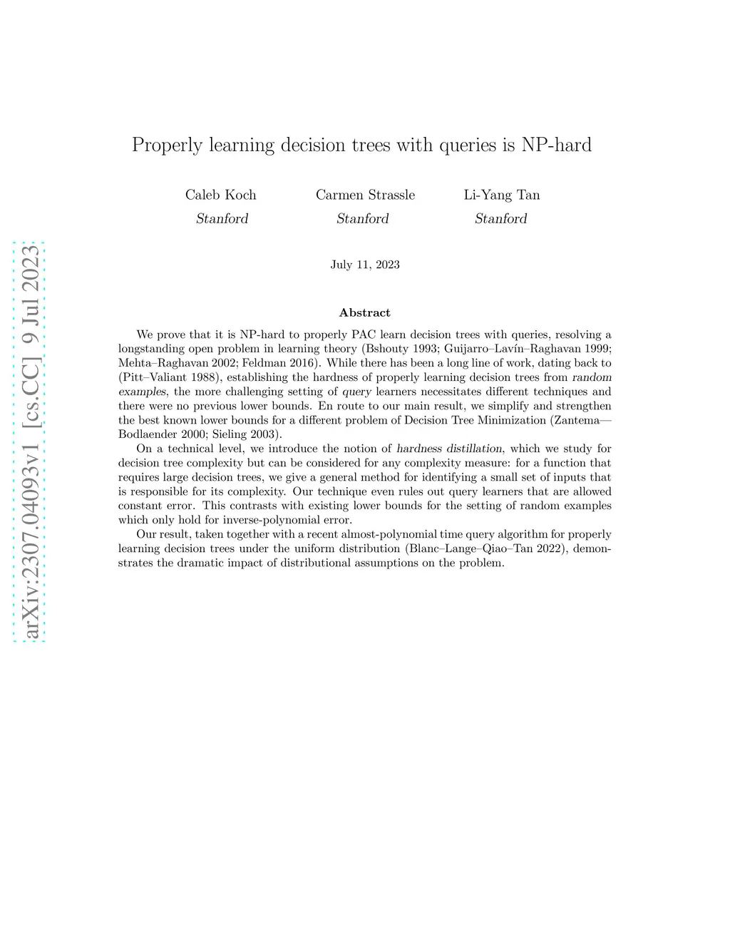 We prove that it is NP-hard to properly PAC learn decision trees with queries, resolving a longstanding open problem in learning theory (Bshouty 1993; Guijarro-Lavin-Raghavan 1999; Mehta-Raghavan 2002; Feldman 2016). While there has been a long line of work, dating back to (Pitt-Valiant 1988), establishing the hardness of properly learning decision trees from random examples, the more challenging setting of query learners necessitates different techniques and there were no previous lower bounds. En route to our main result, we simplify and strengthen the best known lower bounds for a different problem of Decision Tree Minimization (Zantema-Bodlaender 2000; Sieling 2003). On a technical level, we introduce the notion of hardness distillation, which we study for decision tree complexity but can be considered for any complexity measure: for a function that requires large decision trees, we give a general method for identifying a small set of inputs that is responsible for its complexity. Our technique even rules out query learners that are allowed constant error. This contrasts with existing lower bounds for the setting of random examples which only hold for inverse-polynomial error. Our result, taken together with a recent almost-polynomial time query algorithm for properly learning decision trees under the uniform distribution (Blanc-Lange-Qiao-Tan 2022), demonstrates the dramatic impact of distributional assumptions on the problem.