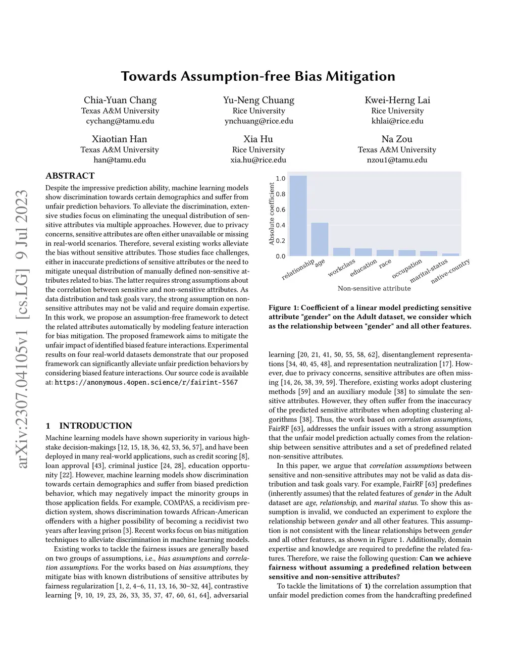 Despite the impressive prediction ability, machine learning models show discrimination towards certain demographics and suffer from unfair prediction behaviors. To alleviate the discrimination, extensive studies focus on eliminating the unequal distribution of sensitive attributes via multiple approaches. However, due to privacy concerns, sensitive attributes are often either unavailable or missing in real-world scenarios. Therefore, several existing works alleviate the bias without sensitive attributes. Those studies face challenges, either in inaccurate predictions of sensitive attributes or the need to mitigate unequal distribution of manually defined non-sensitive attributes related to bias. The latter requires strong assumptions about the correlation between sensitive and non-sensitive attributes. As data distribution and task goals vary, the strong assumption on non-sensitive attributes may not be valid and require domain expertise. In this work, we propose an assumption-free framework to detect the related attributes automatically by modeling feature interaction for bias mitigation. The proposed framework aims to mitigate the unfair impact of identified biased feature interactions. Experimental results on four real-world datasets demonstrate that our proposed framework can significantly alleviate unfair prediction behaviors by considering biased feature interactions.