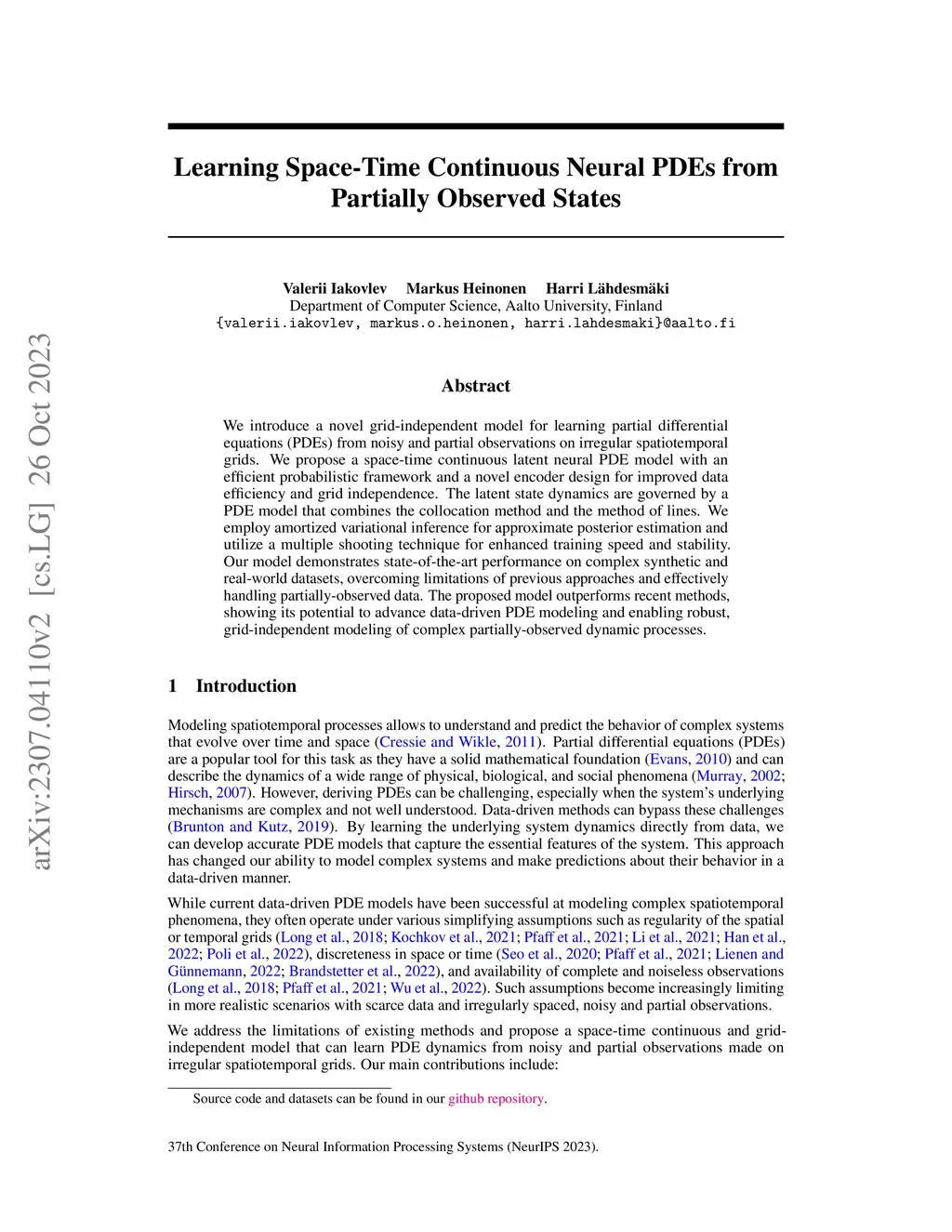 We introduce a novel grid-independent model for learning partial differential equations (PDEs) from noisy and partial observations on irregular spatiotemporal grids. We propose a space-time continuous latent neural PDE model with an efficient probabilistic framework and a novel encoder design for improved data efficiency and grid independence. The latent state dynamics are governed by a PDE model that combines the collocation method and the method of lines. We employ amortized variational inference for approximate posterior estimation and utilize a multiple shooting technique for enhanced training speed and stability. Our model demonstrates state-of-the-art performance on complex synthetic and real-world datasets, overcoming limitations of previous approaches and effectively handling partially-observed data. The proposed model outperforms recent methods, showing its potential to advance data-driven PDE modeling and enabling robust, grid-independent modeling of complex partially-observed dynamic processes.