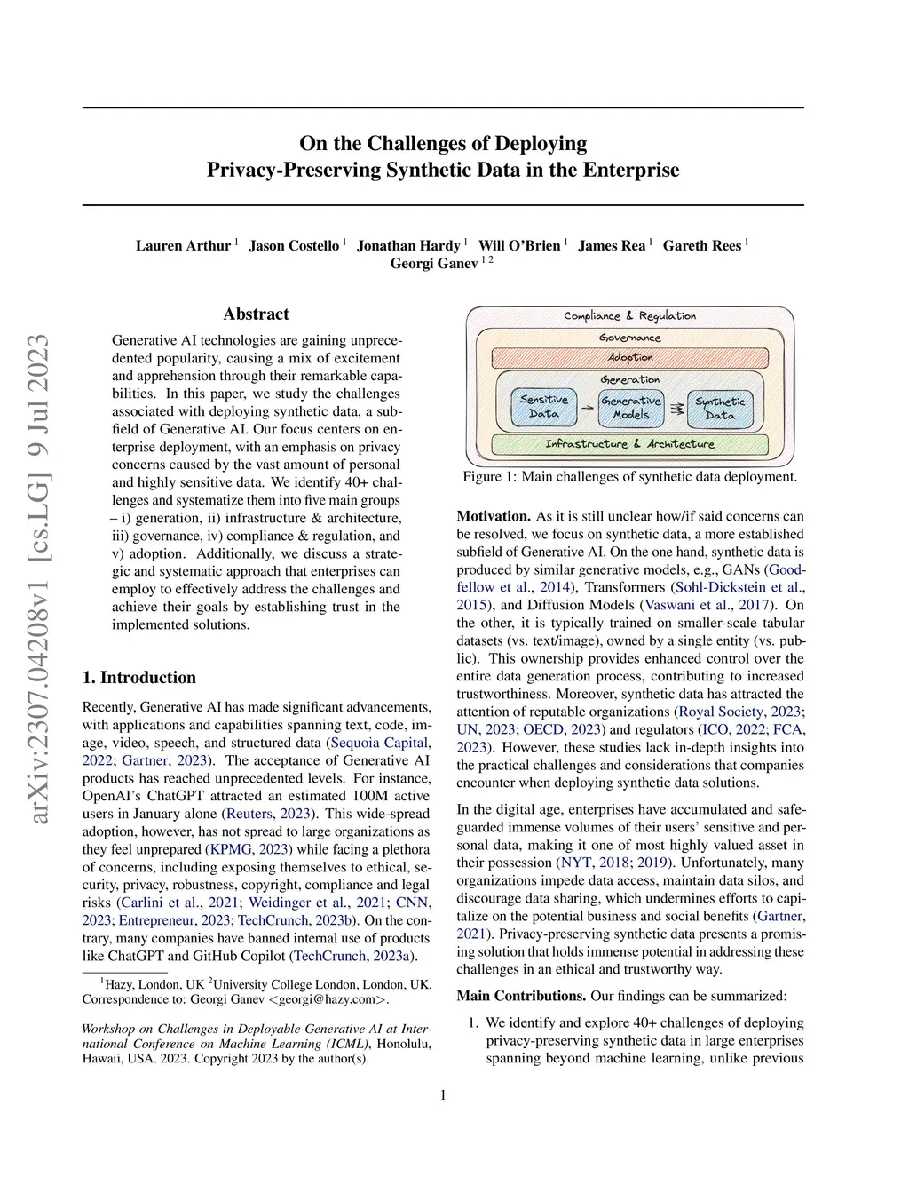 Generative AI technologies are gaining unprecedented popularity, causing a mix of excitement and apprehension through their remarkable capabilities. In this paper, we study the challenges associated with deploying synthetic data, a subfield of Generative AI. Our focus centers on enterprise deployment, with an emphasis on privacy concerns caused by the vast amount of personal and highly sensitive data. We identify 40+ challenges and systematize them into five main groups -- i) generation, ii) infrastructure & architecture, iii) governance, iv) compliance & regulation, and v) adoption. Additionally, we discuss a strategic and systematic approach that enterprises can employ to effectively address the challenges and achieve their goals by establishing trust in the implemented solutions.
