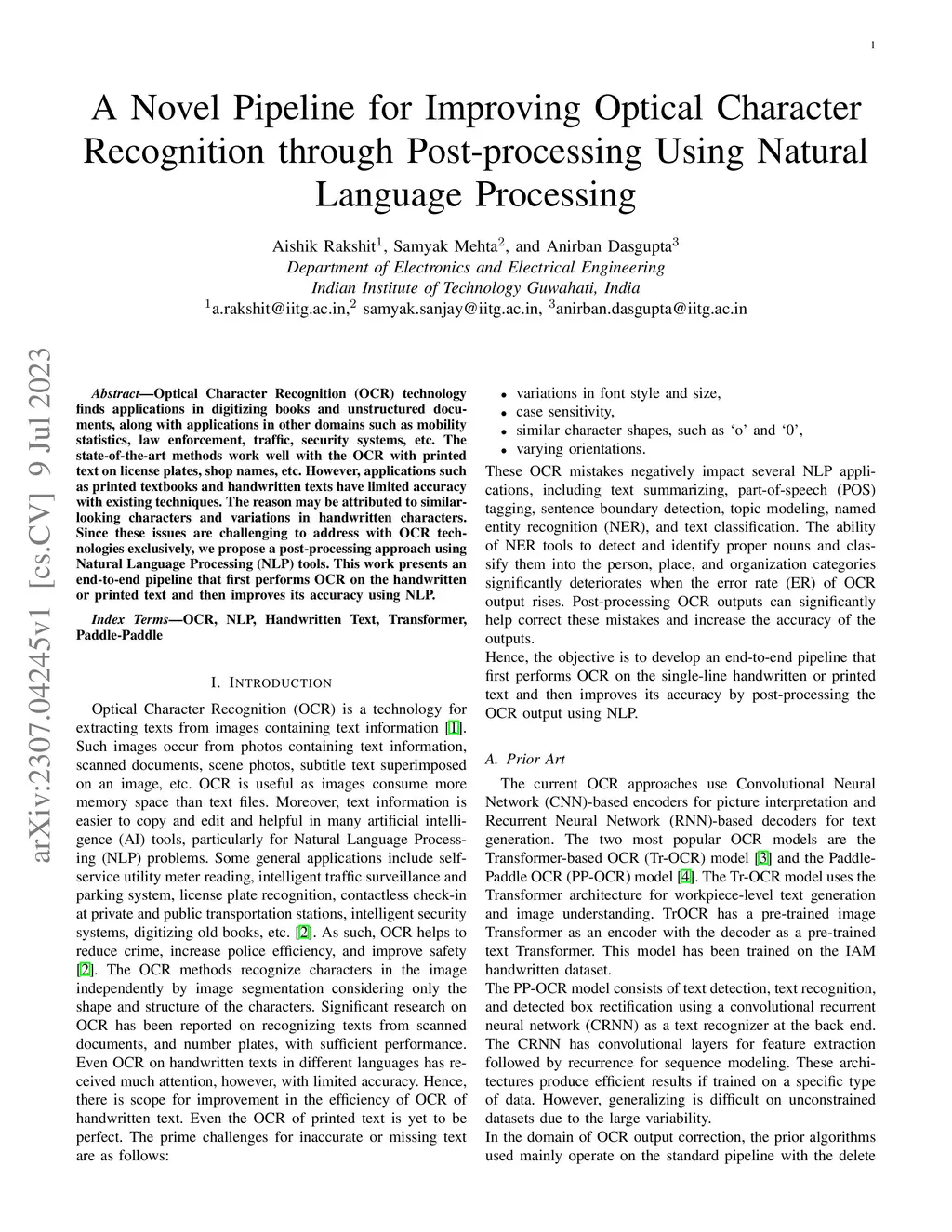 Optical Character Recognition (OCR) technology finds applications in digitizing books and unstructured documents, along with applications in other domains such as mobility statistics, law enforcement, traffic, security systems, etc. The state-of-the-art methods work well with the OCR with printed text on license plates, shop names, etc. However, applications such as printed textbooks and handwritten texts have limited accuracy with existing techniques. The reason may be attributed to similar-looking characters and variations in handwritten characters. Since these issues are challenging to address with OCR technologies exclusively, we propose a post-processing approach using Natural Language Processing (NLP) tools. This work presents an end-to-end pipeline that first performs OCR on the handwritten or printed text and then improves its accuracy using NLP.