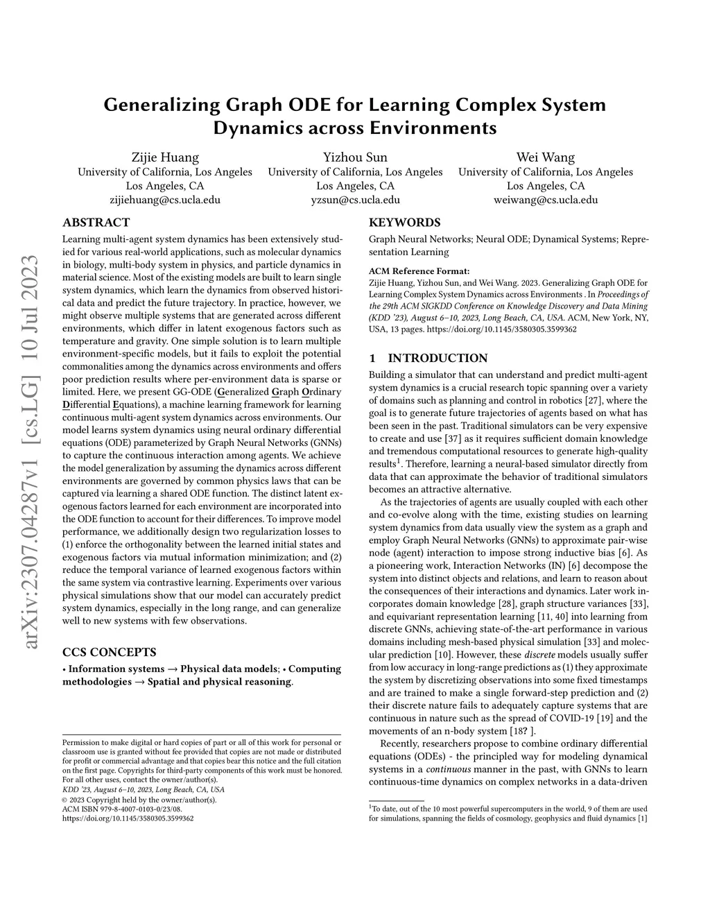 Learning multi-agent system dynamics has been extensively studied for various real-world applications, such as molecular dynamics in biology. Most of the existing models are built to learn single system dynamics from observed historical data and predict the future trajectory. In practice, however, we might observe multiple systems that are generated across different environments, which differ in latent exogenous factors such as temperature and gravity. One simple solution is to learn multiple environment-specific models, but it fails to exploit the potential commonalities among the dynamics across environments and offers poor prediction results where per-environment data is sparse or limited. Here, we present GG-ODE (Generalized Graph Ordinary Differential Equations), a machine learning framework for learning continuous multi-agent system dynamics across environments. Our model learns system dynamics using neural ordinary differential equations (ODE) parameterized by Graph Neural Networks (GNNs) to capture the continuous interaction among agents. We achieve the model generalization by assuming the dynamics across different environments are governed by common physics laws that can be captured via learning a shared ODE function. The distinct latent exogenous factors learned for each environment are incorporated into the ODE function to account for their differences. To improve model performance, we additionally design two regularization losses to (1) enforce the orthogonality between the learned initial states and exogenous factors via mutual information minimization; and (2) reduce the temporal variance of learned exogenous factors within the same system via contrastive learning. Experiments over various physical simulations show that our model can accurately predict system dynamics, especially in the long range, and can generalize well to new systems with few observations.