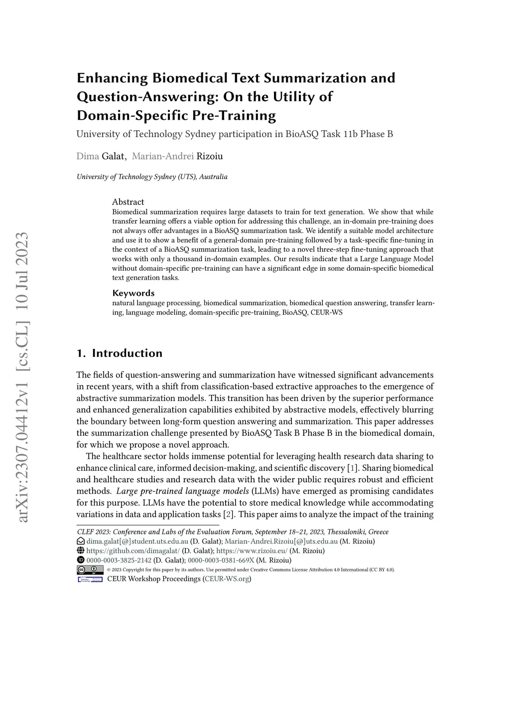Biomedical summarization requires large datasets to train for text generation. We show that while transfer learning offers a viable option for addressing this challenge, an in-domain pre-training does not always offer advantages in a BioASQ summarization task. We identify a suitable model architecture and use it to show a benefit of a general-domain pre-training followed by a task-specific fine-tuning in the context of a BioASQ summarization task, leading to a novel three-step fine-tuning approach that works with only a thousand in-domain examples. Our results indicate that a Large Language Model without domain-specific pre-training can have a significant edge in some domain-specific biomedical text generation tasks.