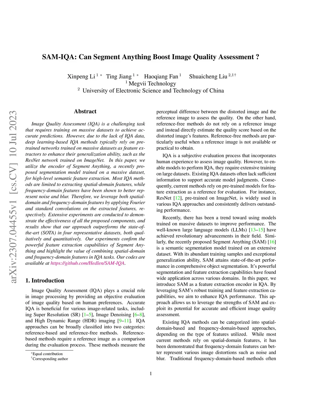 Image Quality Assessment (IQA) is a challenging task that requires training on massive datasets to achieve accurate predictions. However, due to the lack of IQA data, deep learning-based IQA methods typically rely on pre-trained networks trained on massive datasets as feature extractors to enhance their generalization ability, such as the ResNet network trained on ImageNet. In this paper, we utilize the encoder of Segment Anything, a recently proposed segmentation model trained on a massive dataset, for high-level semantic feature extraction. Most IQA methods are limited to extracting spatial-domain features, while frequency-domain features have been shown to better represent noise and blur. Therefore, we leverage both spatial-domain and frequency-domain features by applying Fourier and standard convolutions on the extracted features, respectively. Extensive experiments are conducted to demonstrate the effectiveness of all the proposed components, and results show that our approach outperforms the state-of-the-art (SOTA) in four representative datasets, both qualitatively and quantitatively. Our experiments confirm the powerful feature extraction capabilities of Segment Anything and highlight the value of combining spatial-domain and frequency-domain features in IQA tasks. Code: https://github.com/Hedlen/SAM-IQA