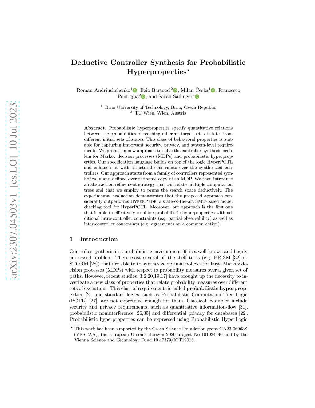 Probabilistic hyperproperties specify quantitative relations between the probabilities of reaching different target sets of states from different initial sets of states. This class of behavioral properties is suitable for capturing important security, privacy, and system-level requirements. We propose a new approach to solve the controller synthesis problem for Markov decision processes (MDPs) and probabilistic hyperproperties. Our specification language builds on top of the logic HyperPCTL and enhances it with structural constraints over the synthesized controllers. Our approach starts from a family of controllers represented symbolically and defined over the same copy of an MDP. We then introduce an abstraction refinement strategy that can relate multiple computation trees and that we employ to prune the search space deductively. The experimental evaluation demonstrates that the proposed approach considerably outperforms HyperProb, a state-of-the-art SMT-based model checking tool for HyperPCTL. Moreover, our approach is the first one that is able to effectively combine probabilistic hyperproperties with additional intra-controller constraints (e.g. partial observability) as well as inter-controller constraints (e.g. agreements on a common action).