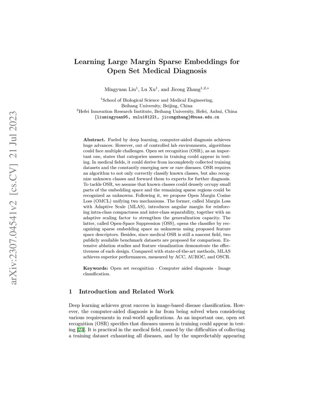 Fueled by deep learning, computer-aided diagnosis achieves huge advances. However, out of controlled lab environments, algorithms could face multiple challenges. Open set recognition (OSR), as an important one, states that categories unseen in training could appear in testing. In medical fields, it could derive from incompletely collected training datasets and the constantly emerging new or rare diseases. OSR requires an algorithm to not only correctly classify known classes, but also recognize unknown classes and forward them to experts for further diagnosis. To tackle OSR, we assume that known classes could densely occupy small parts of the embedding space and the remaining sparse regions could be recognized as unknowns. Following it, we propose Open Margin Cosine Loss (OMCL) unifying two mechanisms. The former, called Margin Loss with Adaptive Scale (MLAS), introduces angular margin for reinforcing intra-class compactness and inter-class separability, together with an adaptive scaling factor to strengthen the generalization capacity. The latter, called Open-Space Suppression (OSS), opens the classifier by recognizing sparse embedding space as unknowns using proposed feature space descriptors. Besides, since medical OSR is still a nascent field, two publicly available benchmark datasets are proposed for comparison. Extensive ablation studies and feature visualization demonstrate the effectiveness of each design. Compared with state-of-the-art methods, MLAS achieves superior performances, measured by ACC, AUROC, and OSCR.