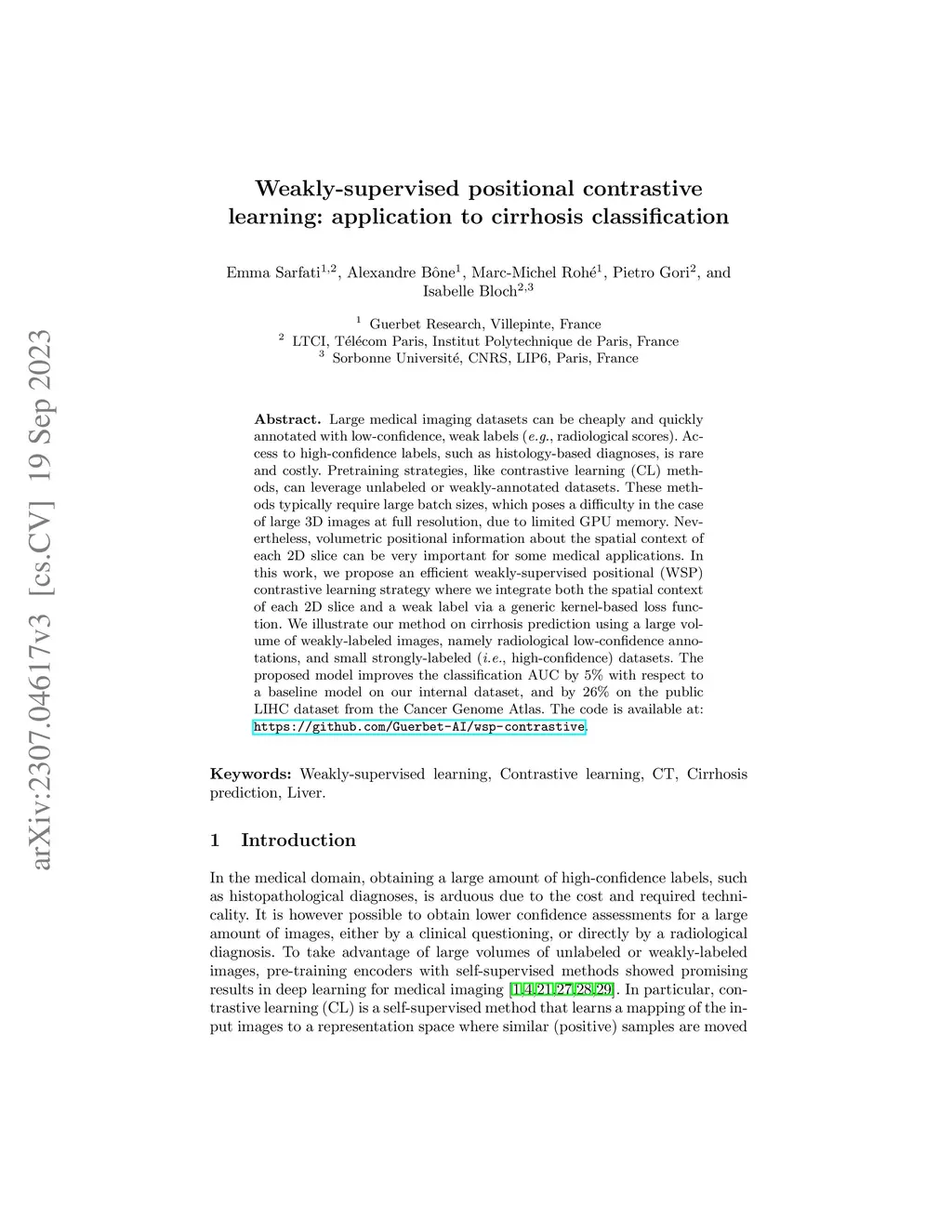 Large medical imaging datasets can be cheaply and quickly annotated with low-confidence, weak labels (e.g., radiological scores). Access to high-confidence labels, such as histology-based diagnoses, is rare and costly. Pretraining strategies, like contrastive learning (CL) methods, can leverage unlabeled or weakly-annotated datasets. These methods typically require large batch sizes, which poses a difficulty in the case of large 3D images at full resolution, due to limited GPU memory. Nevertheless, volumetric positional information about the spatial context of each 2D slice can be very important for some medical applications. In this work, we propose an efficient weakly-supervised positional (WSP) contrastive learning strategy where we integrate both the spatial context of each 2D slice and a weak label via a generic kernel-based loss function. We illustrate our method on cirrhosis prediction using a large volume of weakly-labeled images, namely radiological low-confidence annotations, and small strongly-labeled (i.e., high-confidence) datasets. The proposed model improves the classification AUC by 5% with respect to a baseline model on our internal dataset, and by 26% on the public LIHC dataset from the Cancer Genome Atlas. The code is available at: https://github.com/Guerbet-AI/wsp-contrastive.