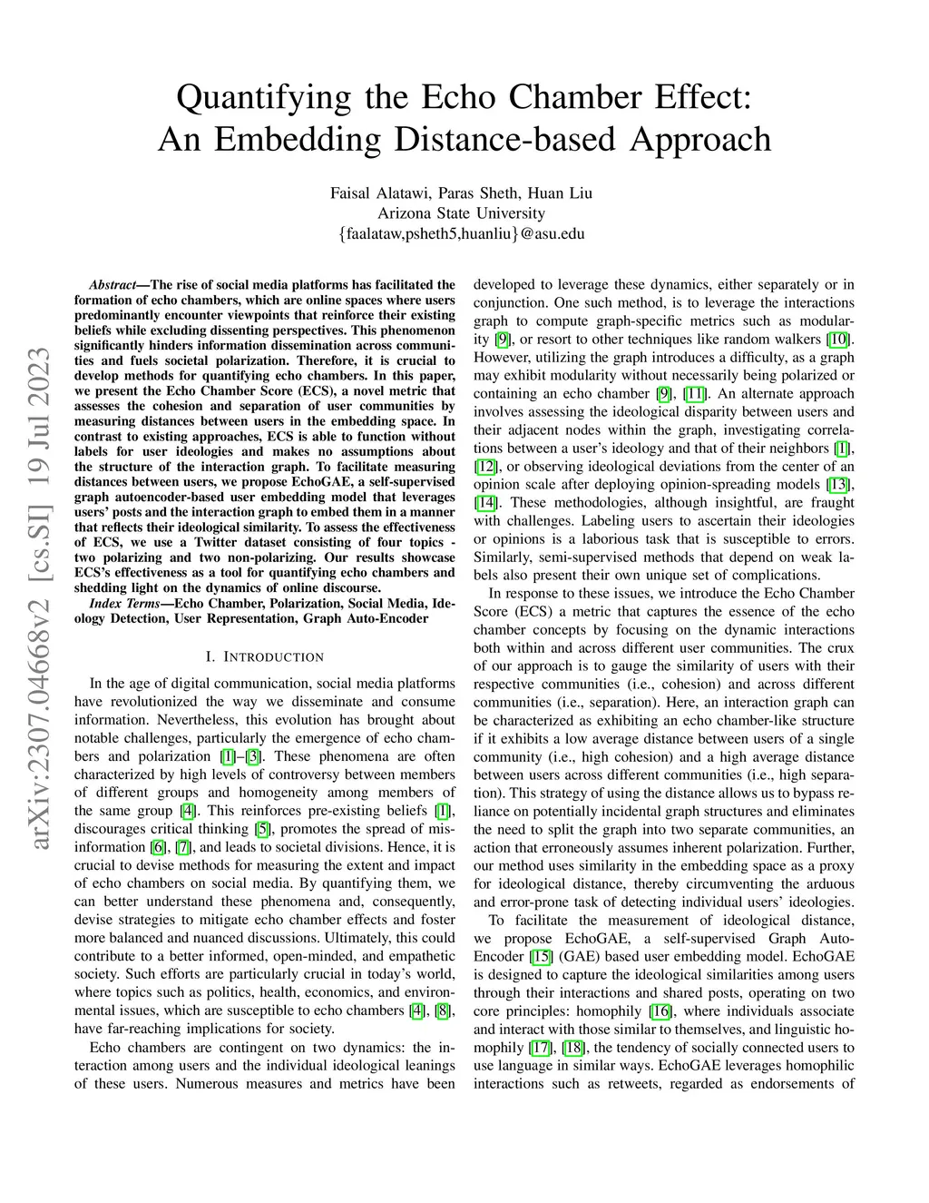 The rise of social media platforms has facilitated the formation of echo chambers, which are online spaces where users predominantly encounter viewpoints that reinforce their existing beliefs while excluding dissenting perspectives. This phenomenon significantly hinders information dissemination across communities and fuels societal polarization. Therefore, it is crucial to develop methods for quantifying echo chambers. In this paper, we present the Echo Chamber Score (ECS), a novel metric that assesses the cohesion and separation of user communities by measuring distances between users in the embedding space. In contrast to existing approaches, ECS is able to function without labels for user ideologies and makes no assumptions about the structure of the interaction graph. To facilitate measuring distances between users, we propose EchoGAE, a self-supervised graph autoencoder-based user embedding model that leverages users' posts and the interaction graph to embed them in a manner that reflects their ideological similarity. To assess the effectiveness of ECS, we use a Twitter dataset consisting of four topics - two polarizing and two non-polarizing. Our results showcase ECS's effectiveness as a tool for quantifying echo chambers and shedding light on the dynamics of online discourse.