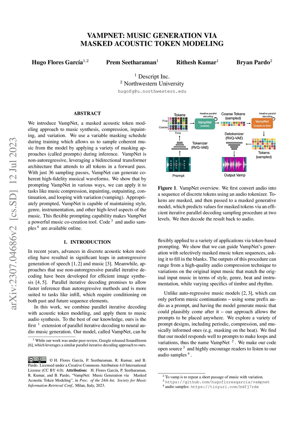 We introduce VampNet, a masked acoustic token modeling approach to music synthesis, compression, inpainting, and variation. We use a variable masking schedule during training which allows us to sample coherent music from the model by applying a variety of masking approaches (called prompts) during inference. VampNet is non-autoregressive, leveraging a bidirectional transformer architecture that attends to all tokens in a forward pass. With just 36 sampling passes, VampNet can generate coherent high-fidelity musical waveforms. We show that by prompting VampNet in various ways, we can apply it to tasks like music compression, inpainting, outpainting, continuation, and looping with variation (vamping). Appropriately prompted, VampNet is capable of maintaining style, genre, instrumentation, and other high-level aspects of the music. This flexible prompting capability makes VampNet a powerful music co-creation tool. Code and audio samples are available online.