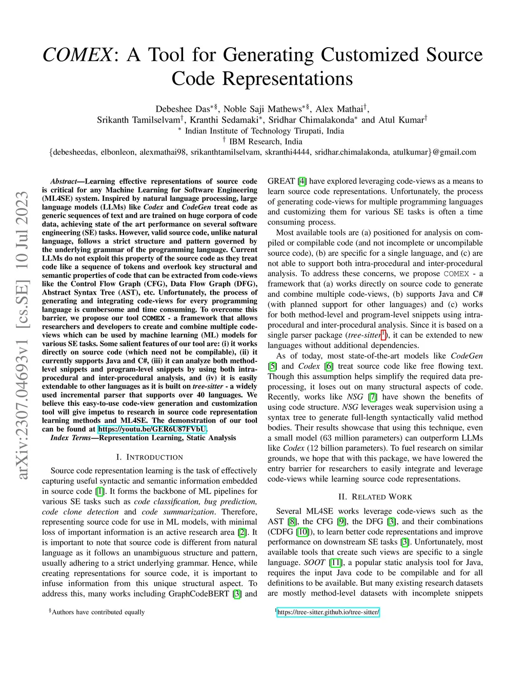 Learning effective representations of source code is critical for any Machine Learning for Software Engineering (ML4SE) system. Inspired by natural language processing, large language models (LLMs) like Codex and CodeGen treat code as generic sequences of text and are trained on huge corpora of code data, achieving state of the art performance on several software engineering (SE) tasks. However, valid source code, unlike natural language, follows a strict structure and pattern governed by the underlying grammar of the programming language. Current LLMs do not exploit this property of the source code as they treat code like a sequence of tokens and overlook key structural and semantic properties of code that can be extracted from code-views like the Control Flow Graph (CFG), Data Flow Graph (DFG), Abstract Syntax Tree (AST), etc. Unfortunately, the process of generating and integrating code-views for every programming language is cumbersome and time consuming. To overcome this barrier, we propose our tool COMEX - a framework that allows researchers and developers to create and combine multiple code-views which can be used by machine learning (ML) models for various SE tasks. Some salient features of our tool are: (i) it works directly on source code (which need not be compilable), (ii) it currently supports Java and C#, (iii) it can analyze both method-level snippets and program-level snippets by using both intra-procedural and inter-procedural analysis, and (iv) it is easily extendable to other languages as it is built on tree-sitter - a widely used incremental parser that supports over 40 languages. We believe this easy-to-use code-view generation and customization tool will give impetus to research in source code representation learning methods and ML4SE. Tool: https://pypi.org/project/comex - GitHub: https://github.com/IBM/tree-sitter-codeviews - Demo: https://youtu.be/GER6U87FVbU