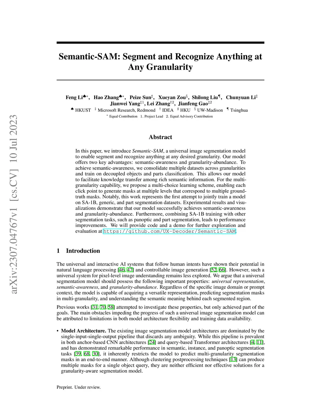Semantic-SAM: Segment and Recognize Anything at Any Granularity