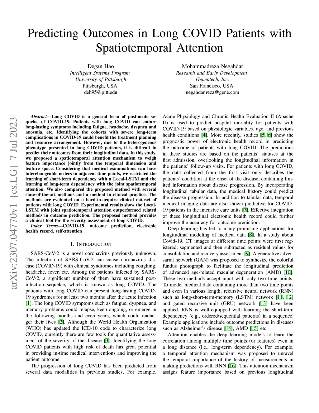 Long COVID is a general term of post-acute sequelae of COVID-19. Patients with long COVID can endure long-lasting symptoms including fatigue, headache, dyspnea and anosmia, etc. Identifying the cohorts with severe long-term complications in COVID-19 could benefit the treatment planning and resource arrangement. However, due to the heterogeneous phenotype presented in long COVID patients, it is difficult to predict their outcomes from their longitudinal data. In this study, we proposed a spatiotemporal attention mechanism to weigh feature importance jointly from the temporal dimension and feature space. Considering that medical examinations can have interchangeable orders in adjacent time points, we restricted the learning of short-term dependency with a Local-LSTM and the learning of long-term dependency with the joint spatiotemporal attention. We also compared the proposed method with several state-of-the-art methods and a method in clinical practice. The methods are evaluated on a hard-to-acquire clinical dataset of patients with long COVID. Experimental results show the Local-LSTM with joint spatiotemporal attention outperformed related methods in outcome prediction. The proposed method provides a clinical tool for the severity assessment of long COVID.