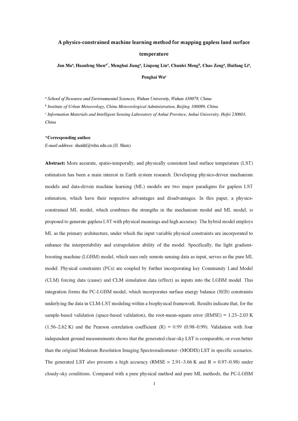 More accurate, spatio-temporally, and physically consistent LST estimation has been a main interest in Earth system research. Developing physics-driven mechanism models and data-driven machine learning (ML) models are two major paradigms for gapless LST estimation, which have their respective advantages and disadvantages. In this paper, a physics-constrained ML model, which combines the strengths in the mechanism model and ML model, is proposed to generate gapless LST with physical meanings and high accuracy. The hybrid model employs ML as the primary architecture, under which the input variable physical constraints are incorporated to enhance the interpretability and extrapolation ability of the model. Specifically, the light gradient-boosting machine (LGBM) model, which uses only remote sensing data as input, serves as the pure ML model. Physical constraints (PCs) are coupled by further incorporating key Community Land Model (CLM) forcing data (cause) and CLM simulation data (effect) as inputs into the LGBM model. This integration forms the PC-LGBM model, which incorporates surface energy balance (SEB) constraints underlying the data in CLM-LST modeling within a biophysical framework. Compared with a pure physical method and pure ML methods, the PC-LGBM model improves the prediction accuracy and physical interpretability of LST. It also demonstrates a good extrapolation ability for the responses to extreme weather cases, suggesting that the PC-LGBM model enables not only empirical learning from data but also rationally derived from theory. The proposed method represents an innovative way to map accurate and physically interpretable gapless LST, and could provide insights to accelerate knowledge discovery in land surface processes and data mining in geographical parameter estimation.