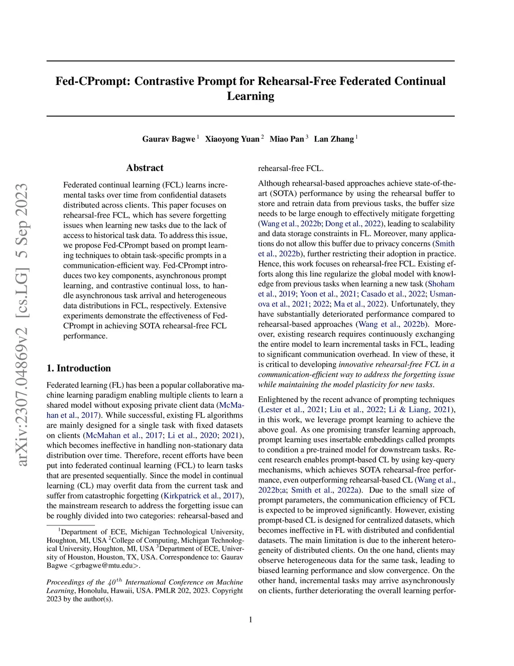 Federated continual learning (FCL) learns incremental tasks over time from confidential datasets distributed across clients. This paper focuses on rehearsal-free FCL, which has severe forgetting issues when learning new tasks due to the lack of access to historical task data. To address this issue, we propose Fed-CPrompt based on prompt learning techniques to obtain task-specific prompts in a communication-efficient way. Fed-CPrompt introduces two key components, asynchronous prompt learning, and contrastive continual loss, to handle asynchronous task arrival and heterogeneous data distributions in FCL, respectively. Extensive experiments demonstrate the effectiveness of Fed-CPrompt in achieving SOTA rehearsal-free FCL performance.