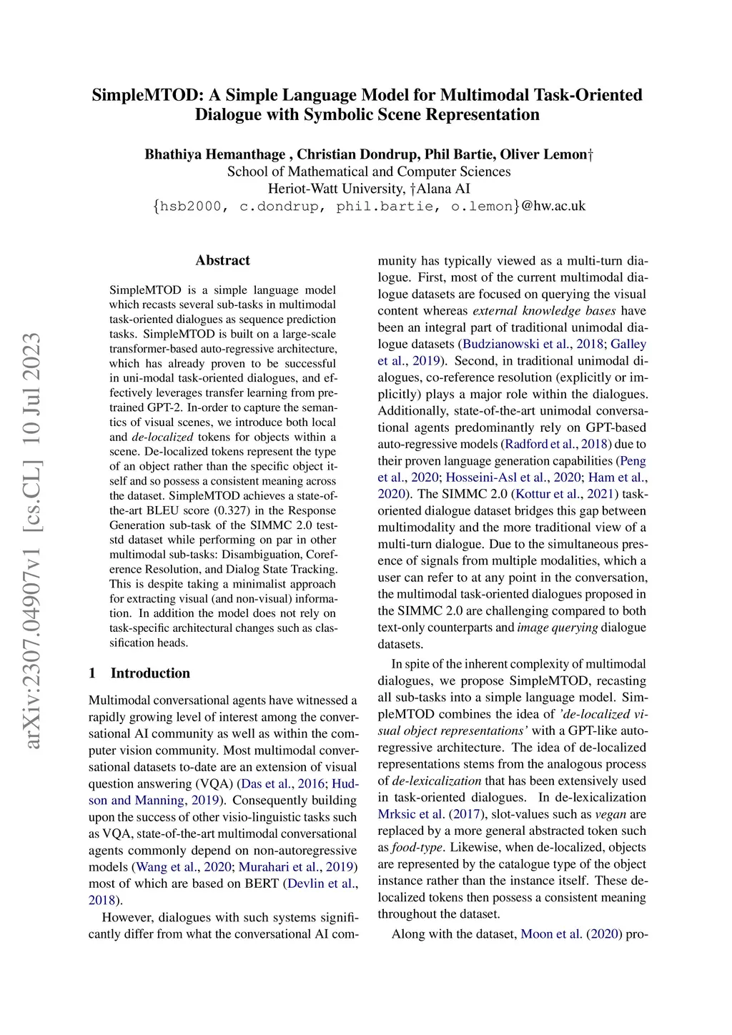 SimpleMTOD is a simple language model which recasts several sub-tasks in multimodal task-oriented dialogues as sequence prediction tasks. SimpleMTOD is built on a large-scale transformer-based auto-regressive architecture, which has already proven to be successful in uni-modal task-oriented dialogues, and effectively leverages transfer learning from pre-trained GPT-2. In-order to capture the semantics of visual scenes, we introduce both local and de-localized tokens for objects within a scene. De-localized tokens represent the type of an object rather than the specific object itself and so possess a consistent meaning across the dataset. SimpleMTOD achieves a state-of-the-art BLEU score (0.327) in the Response Generation sub-task of the SIMMC 2.0 test-std dataset while performing on par in other multimodal sub-tasks: Disambiguation, Coreference Resolution, and Dialog State Tracking. This is despite taking a minimalist approach for extracting visual (and non-visual) information. In addition the model does not rely on task-specific architectural changes such as classification heads.