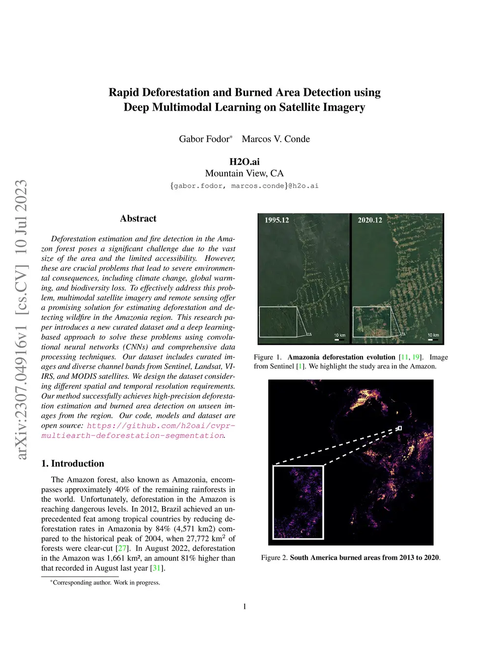 Deforestation estimation and fire detection in the Amazon forest poses a significant challenge due to the vast size of the area and the limited accessibility. However, these are crucial problems that lead to severe environmental consequences, including climate change, global warming, and biodiversity loss. To effectively address this problem, multimodal satellite imagery and remote sensing offer a promising solution for estimating deforestation and detecting wildfire in the Amazonia region. This research paper introduces a new curated dataset and a deep learning-based approach to solve these problems using convolutional neural networks (CNNs) and comprehensive data processing techniques. Our dataset includes curated images and diverse channel bands from Sentinel, Landsat, VIIRS, and MODIS satellites. We design the dataset considering different spatial and temporal resolution requirements. Our method successfully achieves high-precision deforestation estimation and burned area detection on unseen images from the region. Our code, models and dataset are open source: https://github.com/h2oai/cvpr-multiearth-deforestation-segmentation