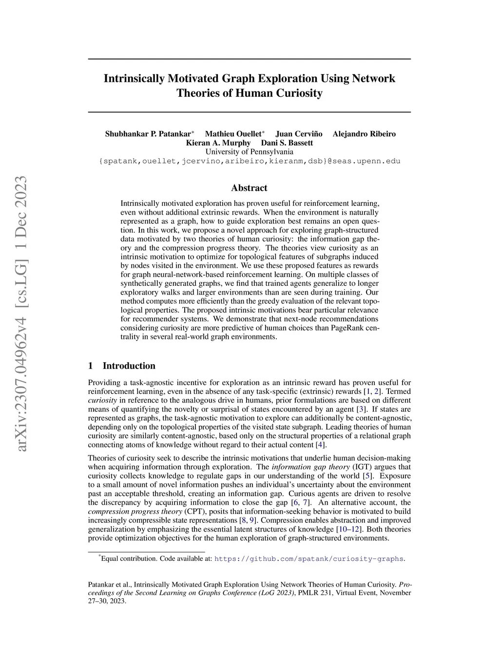 Intrinsically motivated exploration has proven useful for reinforcement learning, even without additional extrinsic rewards. When the environment is naturally represented as a graph, how to guide exploration best remains an open question. In this work, we propose a novel approach for exploring graph-structured data motivated by two theories of human curiosity: the information gap theory and the compression progress theory. The theories view curiosity as an intrinsic motivation to optimize for topological features of subgraphs induced by nodes visited in the environment. We use these proposed features as rewards for graph neural-network-based reinforcement learning. On multiple classes of synthetically generated graphs, we find that trained agents generalize to longer exploratory walks and larger environments than are seen during training. Our method computes more efficiently than the greedy evaluation of the relevant topological properties. The proposed intrinsic motivations bear particular relevance for recommender systems. We demonstrate that next-node recommendations considering curiosity are more predictive of human choices than PageRank centrality in several real-world graph environments, including MovieLens, Amazon Books, and Wikipedia.