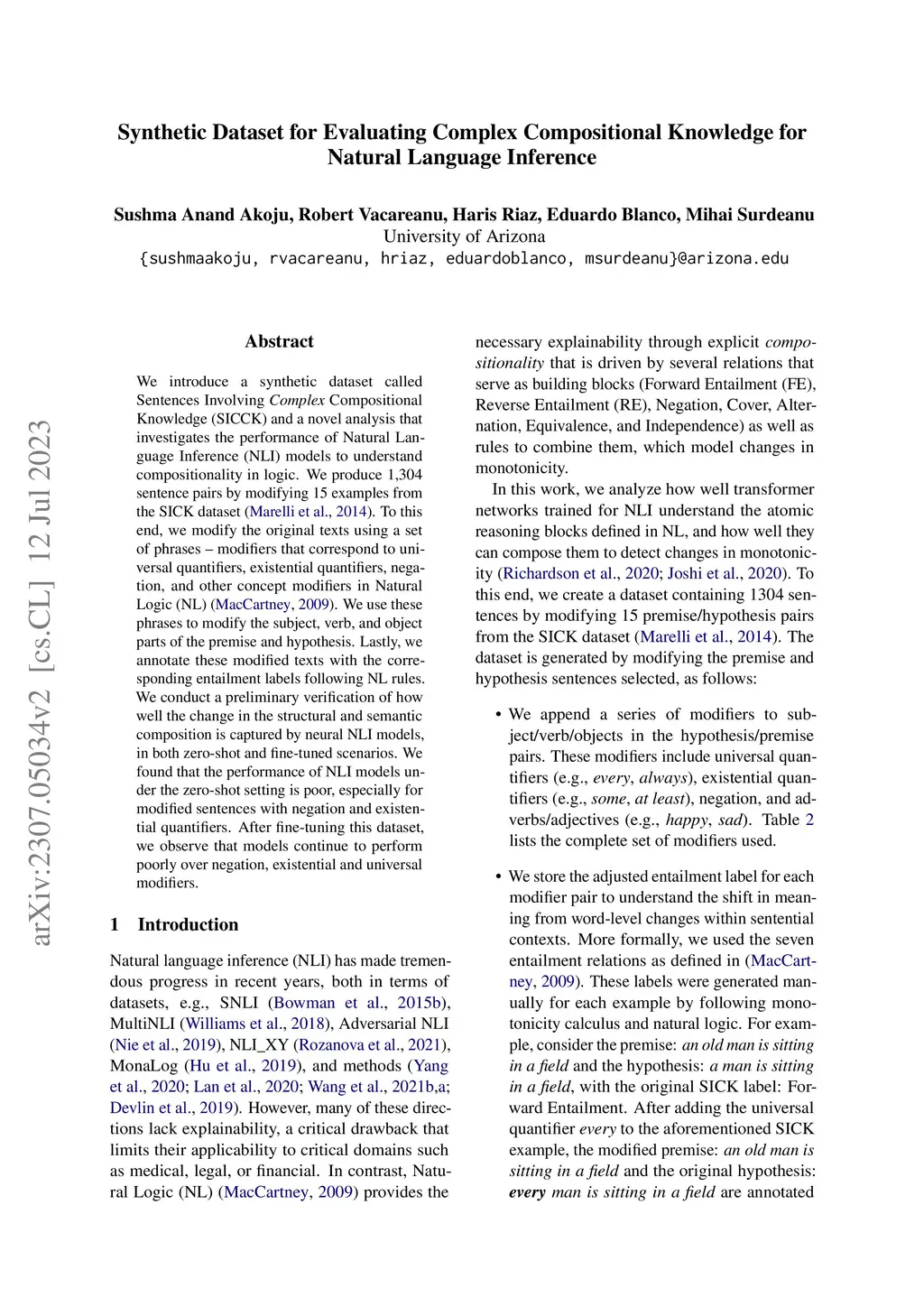 We introduce a synthetic dataset called Sentences Involving Complex Compositional Knowledge (SICCK) and a novel analysis that investigates the performance of Natural Language Inference (NLI) models to understand compositionality in logic. We produce 1,304 sentence pairs by modifying 15 examples from the SICK dataset (Marelli et al., 2014). To this end, we modify the original texts using a set of phrases - modifiers that correspond to universal quantifiers, existential quantifiers, negation, and other concept modifiers in Natural Logic (NL) (MacCartney, 2009). We use these phrases to modify the subject, verb, and object parts of the premise and hypothesis. Lastly, we annotate these modified texts with the corresponding entailment labels following NL rules. We conduct a preliminary verification of how well the change in the structural and semantic composition is captured by neural NLI models, in both zero-shot and fine-tuned scenarios. We found that the performance of NLI models under the zero-shot setting is poor, especially for modified sentences with negation and existential quantifiers. After fine-tuning this dataset, we observe that models continue to perform poorly over negation, existential and universal modifiers.
