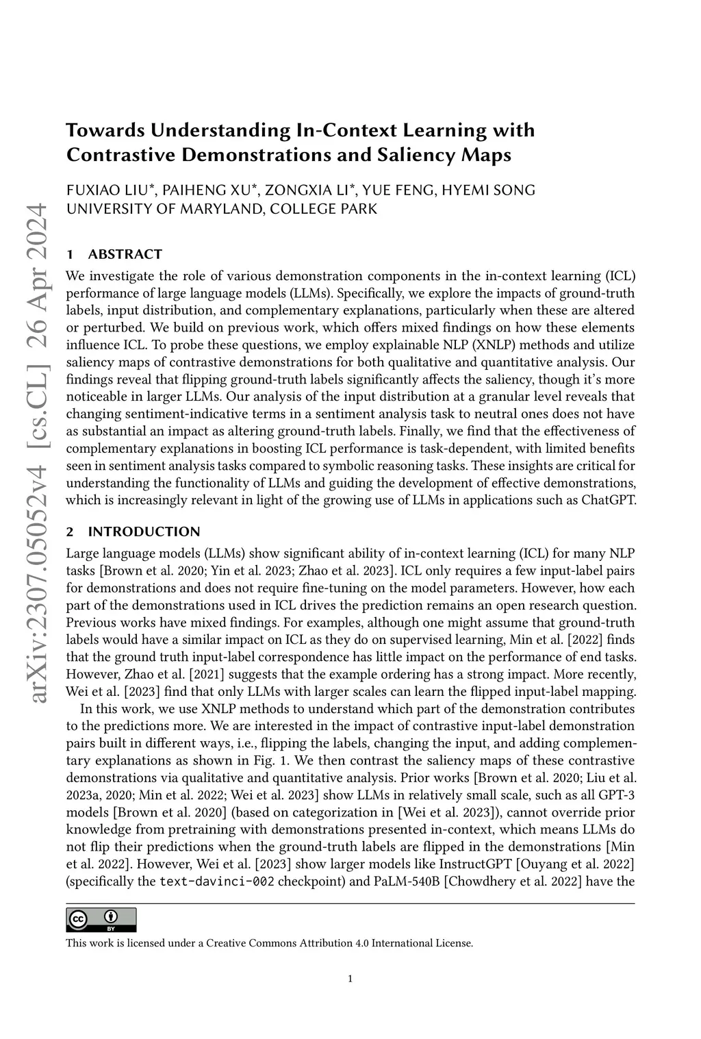 We investigate the role of various demonstration components in the in-context learning (ICL) performance of large language models (LLMs). Specifically, we explore the impacts of ground-truth labels, input distribution, and complementary explanations, particularly when these are altered or perturbed. We build on previous work, which offers mixed findings on how these elements influence ICL. To probe these questions, we employ explainable NLP (XNLP) methods and utilize saliency maps of contrastive demonstrations for both qualitative and quantitative analysis. Our findings reveal that flipping ground-truth labels significantly affects the saliency, though it's more noticeable in larger LLMs. Our analysis of the input distribution at a granular level reveals that changing sentiment-indicative terms in a sentiment analysis task to neutral ones does not have as substantial an impact as altering ground-truth labels. Finally, we find that the effectiveness of complementary explanations in boosting ICL performance is task-dependent, with limited benefits seen in sentiment analysis tasks compared to symbolic reasoning tasks. These insights are critical for understanding the functionality of LLMs and guiding the development of effective demonstrations, which is increasingly relevant in light of the growing use of LLMs in applications such as ChatGPT. Our research code is publicly available at https://github.com/paihengxu/XICL.