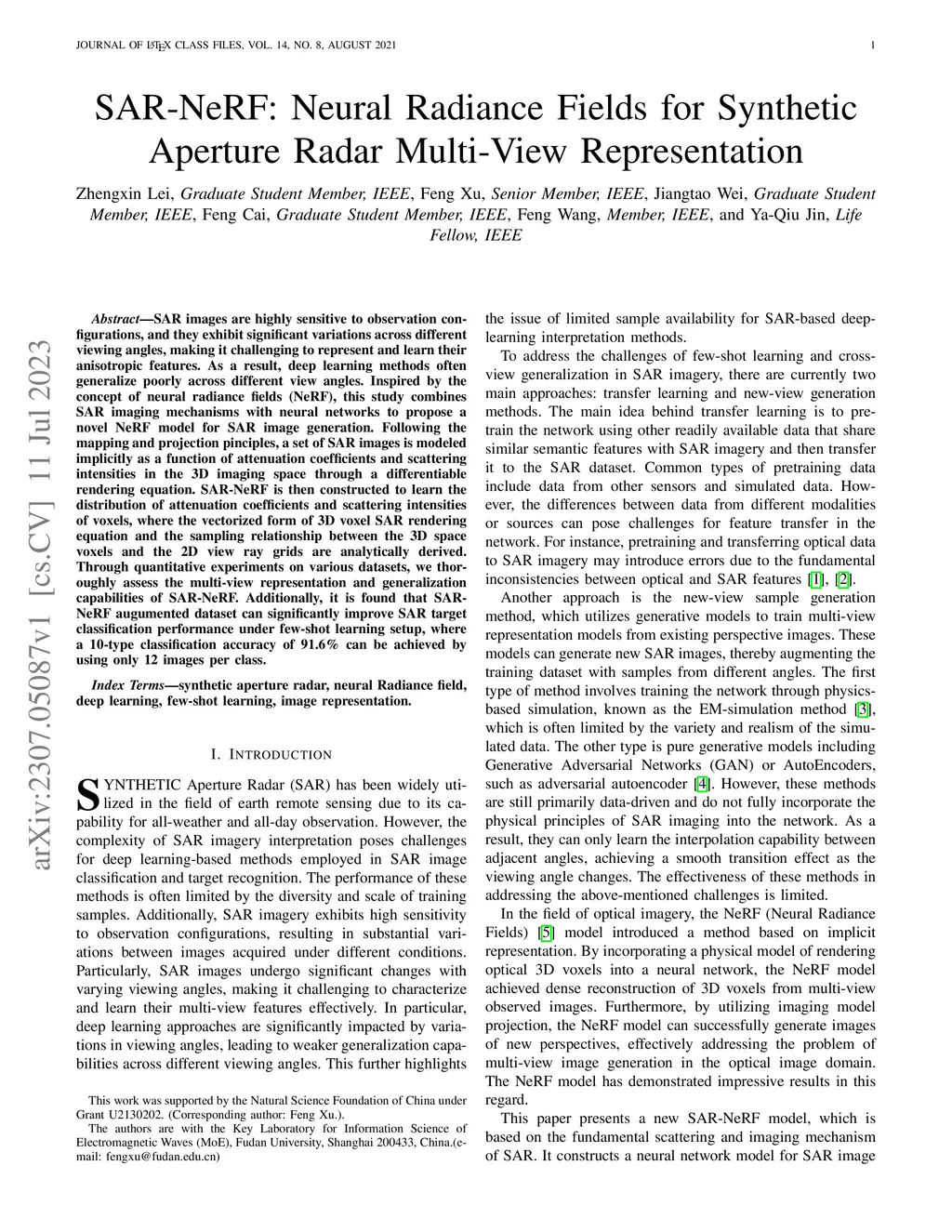 SAR images are highly sensitive to observation configurations, and they exhibit significant variations across different viewing angles, making it challenging to represent and learn their anisotropic features. As a result, deep learning methods often generalize poorly across different view angles. Inspired by the concept of neural radiance fields (NeRF), this study combines SAR imaging mechanisms with neural networks to propose a novel NeRF model for SAR image generation. Following the mapping and projection pinciples, a set of SAR images is modeled implicitly as a function of attenuation coefficients and scattering intensities in the 3D imaging space through a differentiable rendering equation. SAR-NeRF is then constructed to learn the distribution of attenuation coefficients and scattering intensities of voxels, where the vectorized form of 3D voxel SAR rendering equation and the sampling relationship between the 3D space voxels and the 2D view ray grids are analytically derived. Through quantitative experiments on various datasets, we thoroughly assess the multi-view representation and generalization capabilities of SAR-NeRF. Additionally, it is found that SAR-NeRF augumented dataset can significantly improve SAR target classification performance under few-shot learning setup, where a 10-type classification accuracy of 91.6\% can be achieved by using only 12 images per class.