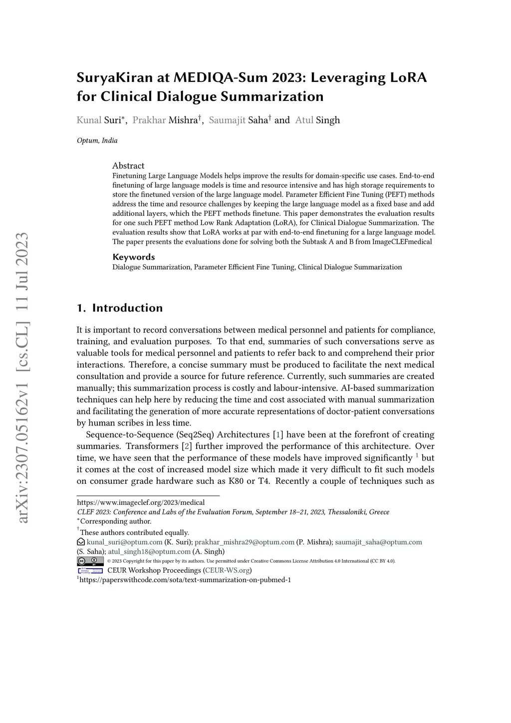 SuryaKiran at MEDIQA-Sum 2023: Leveraging LoRA for Clinical Dialogue