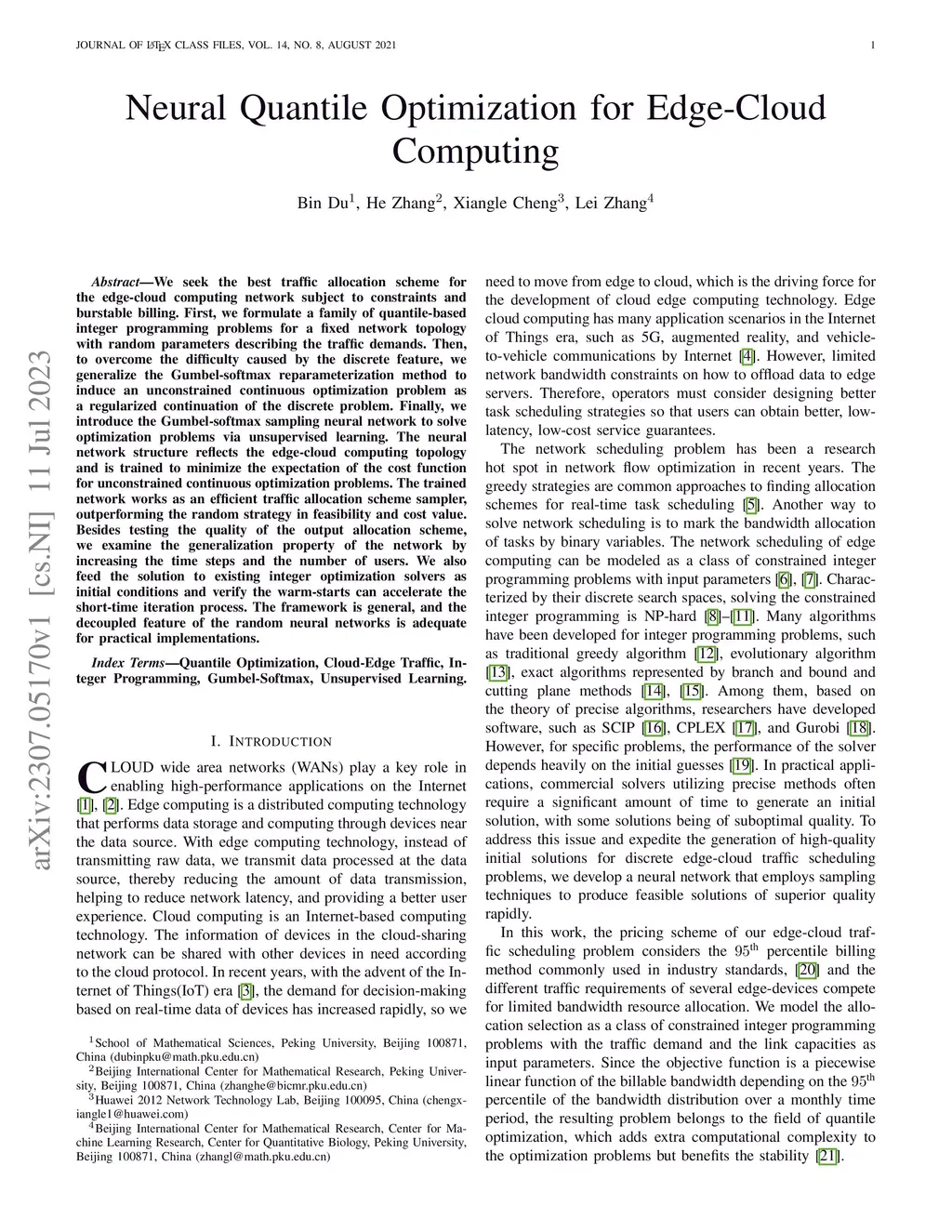 We seek the best traffic allocation scheme for the edge-cloud computing network that satisfies constraints and minimizes the cost based on burstable billing. First, for a fixed network topology, we formulate a family of integer programming problems with random parameters describing the various traffic demands. Then, to overcome the difficulty caused by the discrete feature of the problem, we generalize the Gumbel-softmax reparameterization method to induce an unconstrained continuous optimization problem as a regularized continuation of the discrete problem. Finally, we introduce the Gumbel-softmax sampling network to solve the optimization problems via unsupervised learning. The network structure reflects the edge-cloud computing topology and is trained to minimize the expectation of the cost function for unconstrained continuous optimization problems. The trained network works as an efficient traffic allocation scheme sampler, remarkably outperforming the random strategy in feasibility and cost function value. Besides testing the quality of the output allocation scheme, we examine the generalization property of the network by increasing the time steps and the number of users. We also feed the solution to existing integer optimization solvers as initial conditions and verify the warm-starts can accelerate the short-time iteration process. The framework is general with solid performance, and the decoupled feature of the random neural networks is adequate for practical implementations.