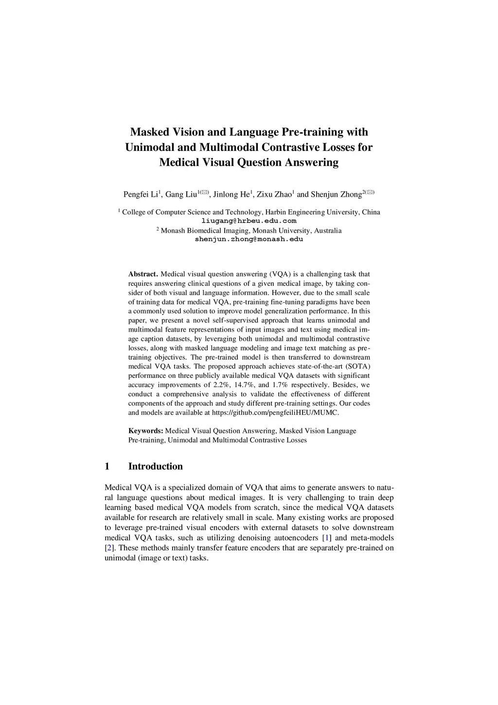 Medical visual question answering (VQA) is a challenging task that requires answering clinical questions of a given medical image, by taking consider of both visual and language information. However, due to the small scale of training data for medical VQA, pre-training fine-tuning paradigms have been a commonly used solution to improve model generalization performance. In this paper, we present a novel self-supervised approach that learns unimodal and multimodal feature representations of input images and text using medical image caption datasets, by leveraging both unimodal and multimodal contrastive losses, along with masked language modeling and image text matching as pretraining objectives. The pre-trained model is then transferred to downstream medical VQA tasks. The proposed approach achieves state-of-the-art (SOTA) performance on three publicly available medical VQA datasets with significant accuracy improvements of 2.2%, 14.7%, and 1.7% respectively. Besides, we conduct a comprehensive analysis to validate the effectiveness of different components of the approach and study different pre-training settings. Our codes and models are available at https://github.com/pengfeiliHEU/MUMC.