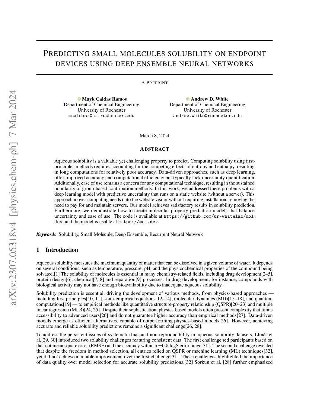 Aqueous solubility is a valuable yet challenging property to predict. Computing solubility using first-principles methods requires accounting for the competing effects of entropy and enthalpy, resulting in long computations for relatively poor accuracy. Data-driven approaches, such as deep learning, offer improved accuracy and computational efficiency but typically lack uncertainty quantification. Additionally, ease of use remains a concern for any computational technique, resulting in the sustained popularity of group-based contribution methods. In this work, we addressed these problems with a deep learning model with predictive uncertainty that runs on a static website (without a server). This approach moves computing needs onto the website visitor without requiring installation, removing the need to pay for and maintain servers. Our model achieves satisfactory results in solubility prediction. Furthermore, we demonstrate how to create molecular property prediction models that balance uncertainty and ease of use. The code is available at https://github.com/ur-whitelab/mol.dev, and the model is usable at https://mol.dev.