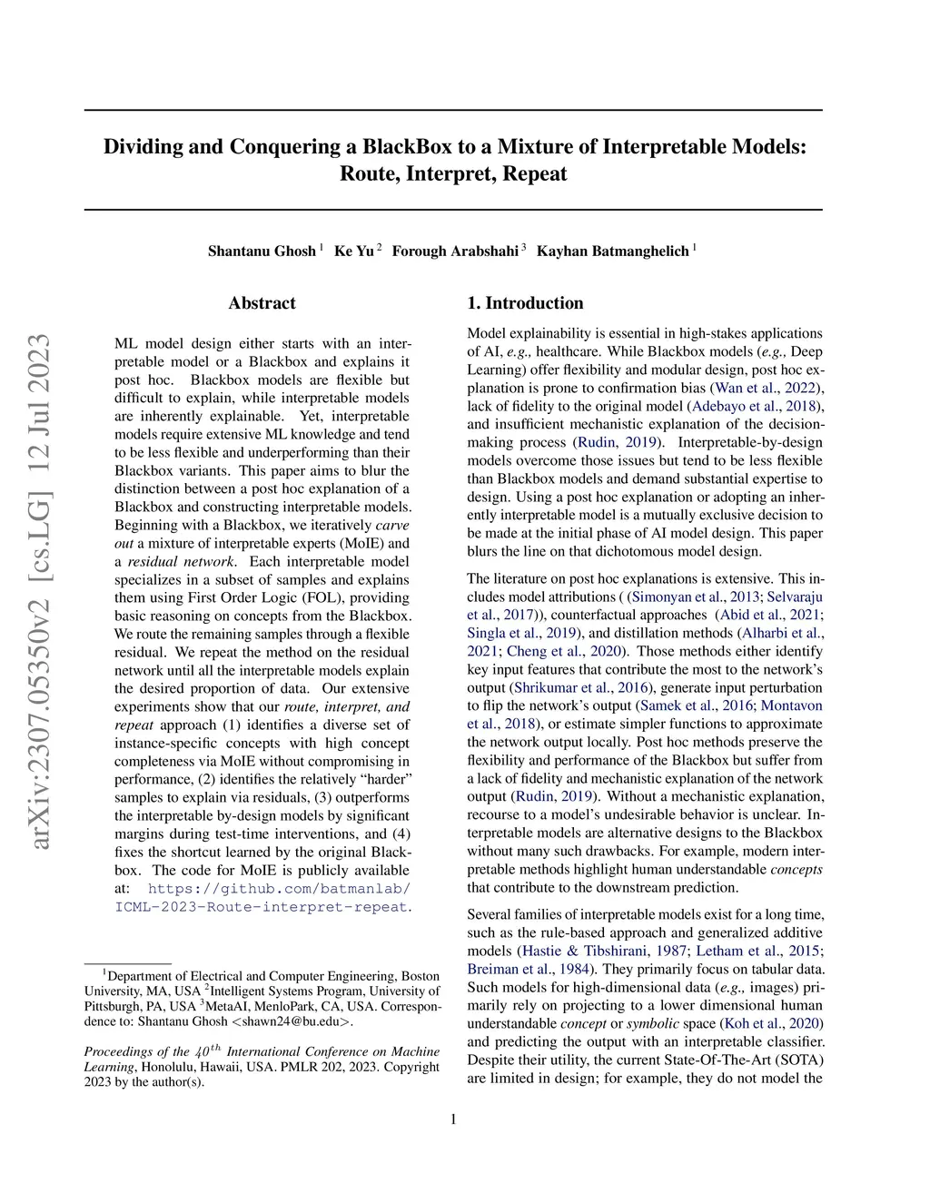 ML model design either starts with an interpretable model or a Blackbox and explains it post hoc. Blackbox models are flexible but difficult to explain, while interpretable models are inherently explainable. Yet, interpretable models require extensive ML knowledge and tend to be less flexible and underperforming than their Blackbox variants. This paper aims to blur the distinction between a post hoc explanation of a Blackbox and constructing interpretable models. Beginning with a Blackbox, we iteratively carve out a mixture of interpretable experts (MoIE) and a residual network. Each interpretable model specializes in a subset of samples and explains them using First Order Logic (FOL), providing basic reasoning on concepts from the Blackbox. We route the remaining samples through a flexible residual. We repeat the method on the residual network until all the interpretable models explain the desired proportion of data. Our extensive experiments show that our route, interpret, and repeat approach (1) identifies a diverse set of instance-specific concepts with high concept completeness via MoIE without compromising in performance, (2) identifies the relatively ``harder'' samples to explain via residuals, (3) outperforms the interpretable by-design models by significant margins during test-time interventions, and (4) fixes the shortcut learned by the original Blackbox. The code for MoIE is publicly available at: \url{https://github.com/batmanlab/ICML-2023-Route-interpret-repeat}