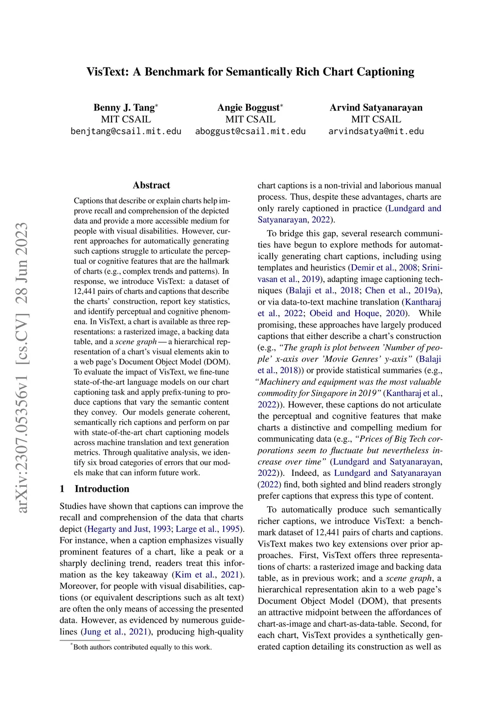 Captions that describe or explain charts help improve recall and comprehension of the depicted data and provide a more accessible medium for people with visual disabilities. However, current approaches for automatically generating such captions struggle to articulate the perceptual or cognitive features that are the hallmark of charts (e.g., complex trends and patterns). In response, we introduce VisText: a dataset of 12,441 pairs of charts and captions that describe the charts' construction, report key statistics, and identify perceptual and cognitive phenomena. In VisText, a chart is available as three representations: a rasterized image, a backing data table, and a scene graph -- a hierarchical representation of a chart's visual elements akin to a web page's Document Object Model (DOM). To evaluate the impact of VisText, we fine-tune state-of-the-art language models on our chart captioning task and apply prefix-tuning to produce captions that vary the semantic content they convey. Our models generate coherent, semantically rich captions and perform on par with state-of-the-art chart captioning models across machine translation and text generation metrics. Through qualitative analysis, we identify six broad categories of errors that our models make that can inform future work.
