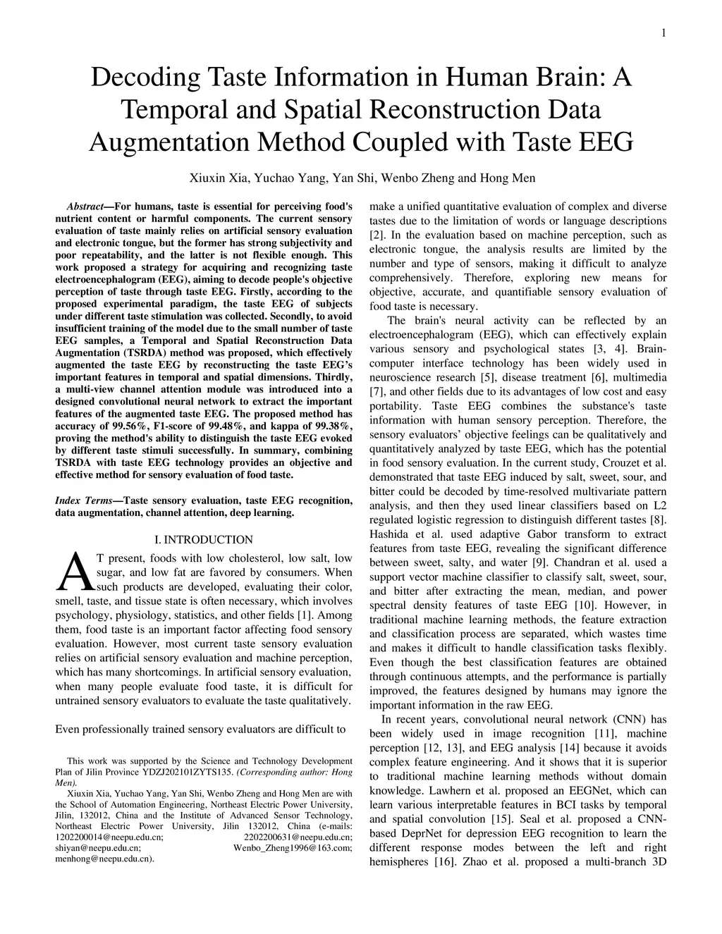 For humans, taste is essential for perceiving food's nutrient content or harmful components. The current sensory evaluation of taste mainly relies on artificial sensory evaluation and electronic tongue, but the former has strong subjectivity and poor repeatability, and the latter is not flexible enough. This work proposed a strategy for acquiring and recognizing taste electroencephalogram (EEG), aiming to decode people's objective perception of taste through taste EEG. Firstly, according to the proposed experimental paradigm, the taste EEG of subjects under different taste stimulation was collected. Secondly, to avoid insufficient training of the model due to the small number of taste EEG samples, a Temporal and Spatial Reconstruction Data Augmentation (TSRDA) method was proposed, which effectively augmented the taste EEG by reconstructing the taste EEG's important features in temporal and spatial dimensions. Thirdly, a multi-view channel attention module was introduced into a designed convolutional neural network to extract the important features of the augmented taste EEG. The proposed method has accuracy of 99.56%, F1-score of 99.48%, and kappa of 99.38%, proving the method's ability to distinguish the taste EEG evoked by different taste stimuli successfully. In summary, combining TSRDA with taste EEG technology provides an objective and effective method for sensory evaluation of food taste.