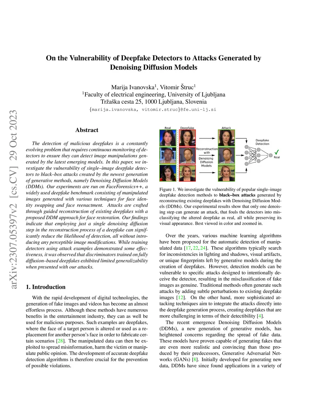The detection of malicious deepfakes is a constantly evolving problem that requires continuous monitoring of detectors to ensure they can detect image manipulations generated by the latest emerging models. In this paper, we investigate the vulnerability of single-image deepfake detectors to black-box attacks created by the newest generation of generative methods, namely Denoising Diffusion Models (DDMs). Our experiments are run on FaceForensics++, a widely used deepfake benchmark consisting of manipulated images generated with various techniques for face identity swapping and face reenactment. Attacks are crafted through guided reconstruction of existing deepfakes with a proposed DDM approach for face restoration. Our findings indicate that employing just a single denoising diffusion step in the reconstruction process of a deepfake can significantly reduce the likelihood of detection, all without introducing any perceptible image modifications. While training detectors using attack examples demonstrated some effectiveness, it was observed that discriminators trained on fully diffusion-based deepfakes exhibited limited generalizability when presented with our attacks.