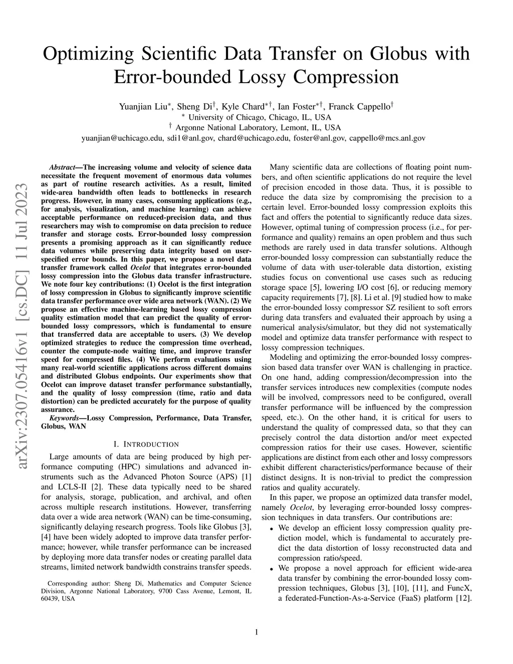 The increasing volume and velocity of science data necessitate the frequent movement of enormous data volumes as part of routine research activities. As a result, limited wide-area bandwidth often leads to bottlenecks in research progress. However, in many cases, consuming applications (e.g., for analysis, visualization, and machine learning) can achieve acceptable performance on reduced-precision data, and thus researchers may wish to compromise on data precision to reduce transfer and storage costs. Error-bounded lossy compression presents a promising approach as it can significantly reduce data volumes while preserving data integrity based on user-specified error bounds. In this paper, we propose a novel data transfer framework called Ocelot that integrates error-bounded lossy compression into the Globus data transfer infrastructure. We note four key contributions: (1) Ocelot is the first integration of lossy compression in Globus to significantly improve scientific data transfer performance over wide area network (WAN). (2) We propose an effective machine-learning based lossy compression quality estimation model that can predict the quality of error-bounded lossy compressors, which is fundamental to ensure that transferred data are acceptable to users. (3) We develop optimized strategies to reduce the compression time overhead, counter the compute-node waiting time, and improve transfer speed for compressed files. (4) We perform evaluations using many real-world scientific applications across different domains and distributed Globus endpoints. Our experiments show that Ocelot can improve dataset transfer performance substantially, and the quality of lossy compression (time, ratio and data distortion) can be predicted accurately for the purpose of quality assurance.