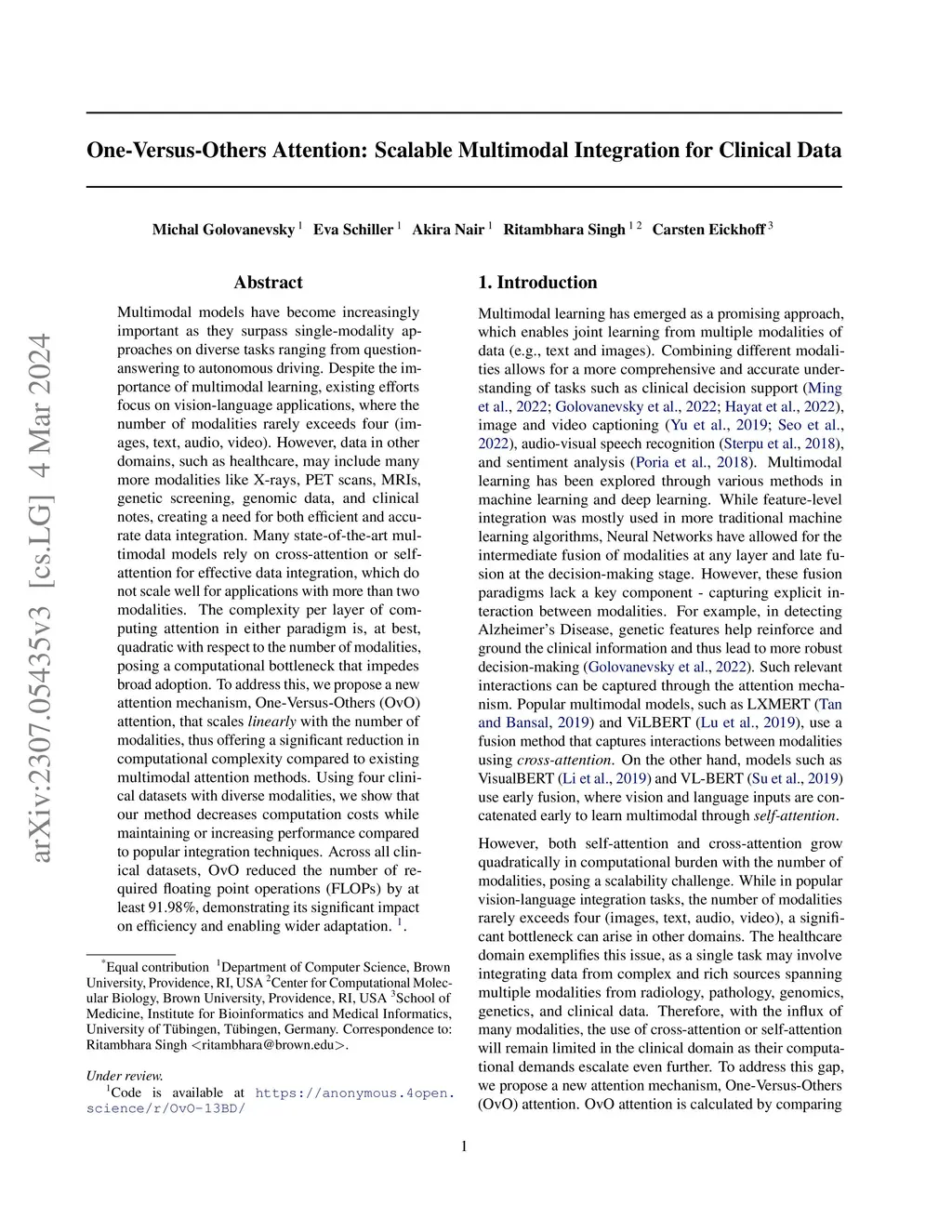 Multimodal learning models have become increasingly important as they surpass single-modality approaches on diverse tasks ranging from question-answering to autonomous driving. Despite the importance of multimodal learning, existing efforts focus on NLP applications, where the number of modalities is typically less than four (audio, video, text, images). However, data inputs in other domains, such as the medical field, may include X-rays, PET scans, MRIs, genetic screening, clinical notes, and more, creating a need for both efficient and accurate information fusion. Many state-of-the-art models rely on pairwise cross-modal attention, which does not scale well for applications with more than three modalities. For modalities, computing attention will result in operations, potentially requiring considerable amounts of computational resources. To address this, we propose a new domain-neutral attention mechanism, One-Versus-Others (OvO) attention, that scales linearly with the number of modalities and requires only attention operations, thus offering a significant reduction in computational complexity compared to existing cross-modal attention algorithms. Using three diverse real-world datasets as well as an additional simulation experiment, we show that our method improves performance compared to popular fusion techniques while decreasing computation costs.