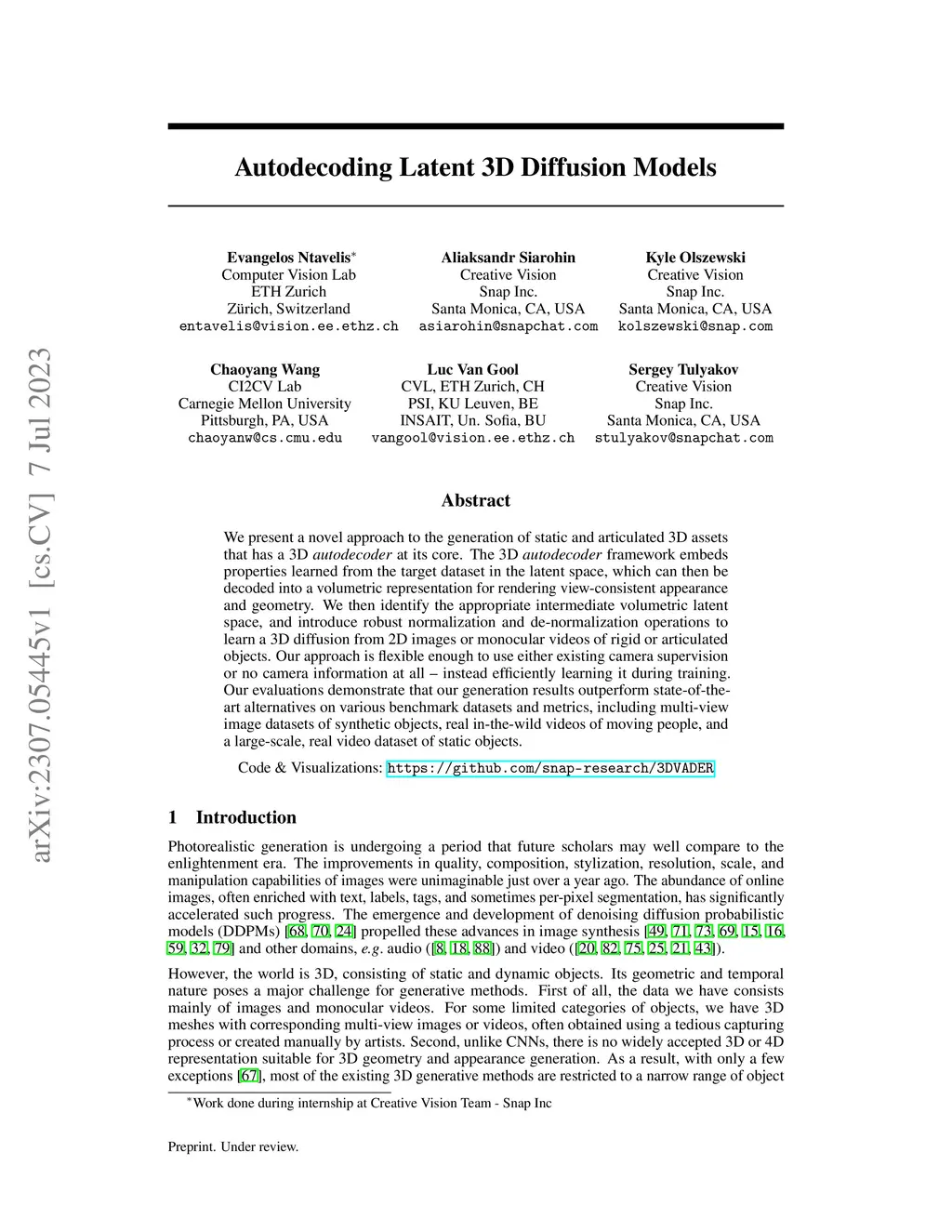 We present a novel approach to the generation of static and articulated 3D assets that has a 3D autodecoder at its core. The 3D autodecoder framework embeds properties learned from the target dataset in the latent space, which can then be decoded into a volumetric representation for rendering view-consistent appearance and geometry. We then identify the appropriate intermediate volumetric latent space, and introduce robust normalization and de-normalization operations to learn a 3D diffusion from 2D images or monocular videos of rigid or articulated objects. Our approach is flexible enough to use either existing camera supervision or no camera information at all -- instead efficiently learning it during training. Our evaluations demonstrate that our generation results outperform state-of-the-art alternatives on various benchmark datasets and metrics, including multi-view image datasets of synthetic objects, real in-the-wild videos of moving people, and a large-scale, real video dataset of static objects.