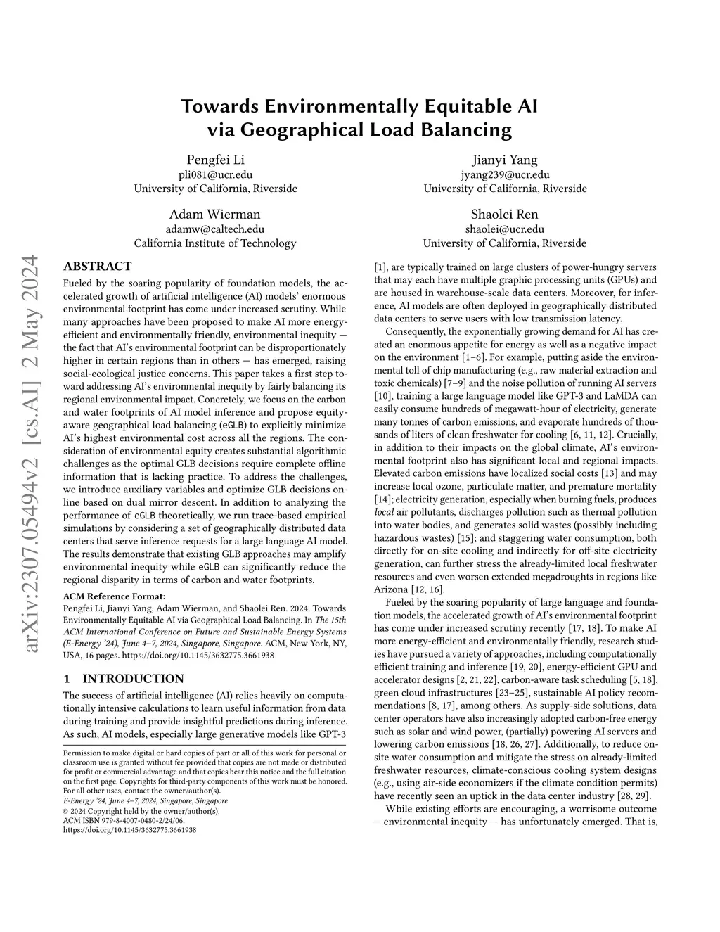 Towards Environmentally Equitable AI via Geographical Load Balancing