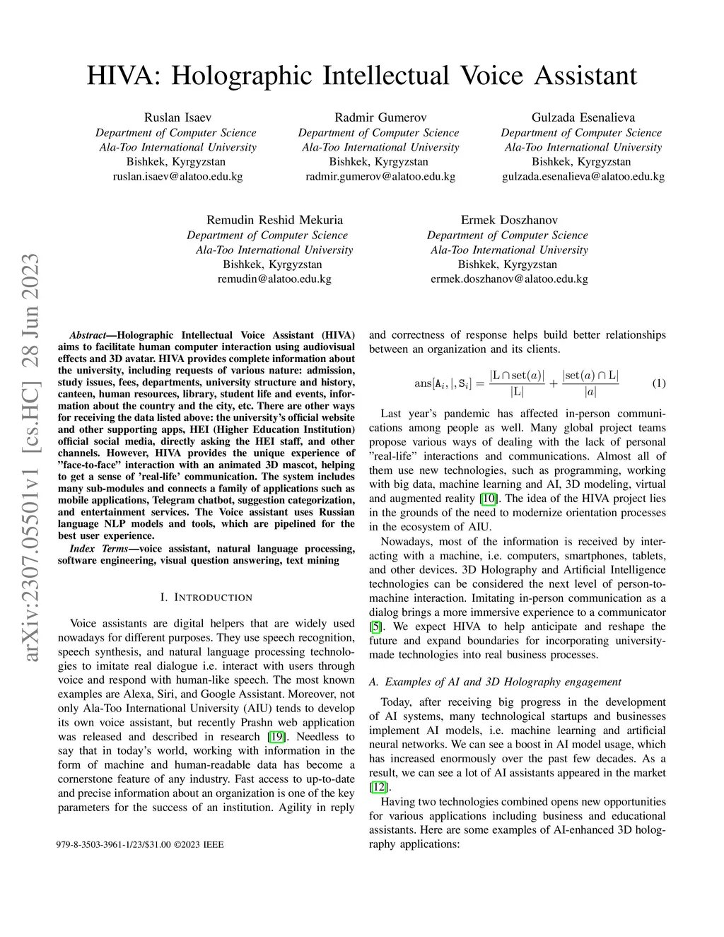 Holographic Intellectual Voice Assistant (HIVA) aims to facilitate human computer interaction using audiovisual effects and 3D avatar. HIVA provides complete information about the university, including requests of various nature: admission, study issues, fees, departments, university structure and history, canteen, human resources, library, student life and events, information about the country and the city, etc. There are other ways for receiving the data listed above: the university's official website and other supporting apps, HEI (Higher Education Institution) official social media, directly asking the HEI staff, and other channels. However, HIVA provides the unique experience of "face-to-face" interaction with an animated 3D mascot, helping to get a sense of 'real-life' communication. The system includes many sub-modules and connects a family of applications such as mobile applications, Telegram chatbot, suggestion categorization, and entertainment services. The Voice assistant uses Russian language NLP models and tools, which are pipelined for the best user experience.