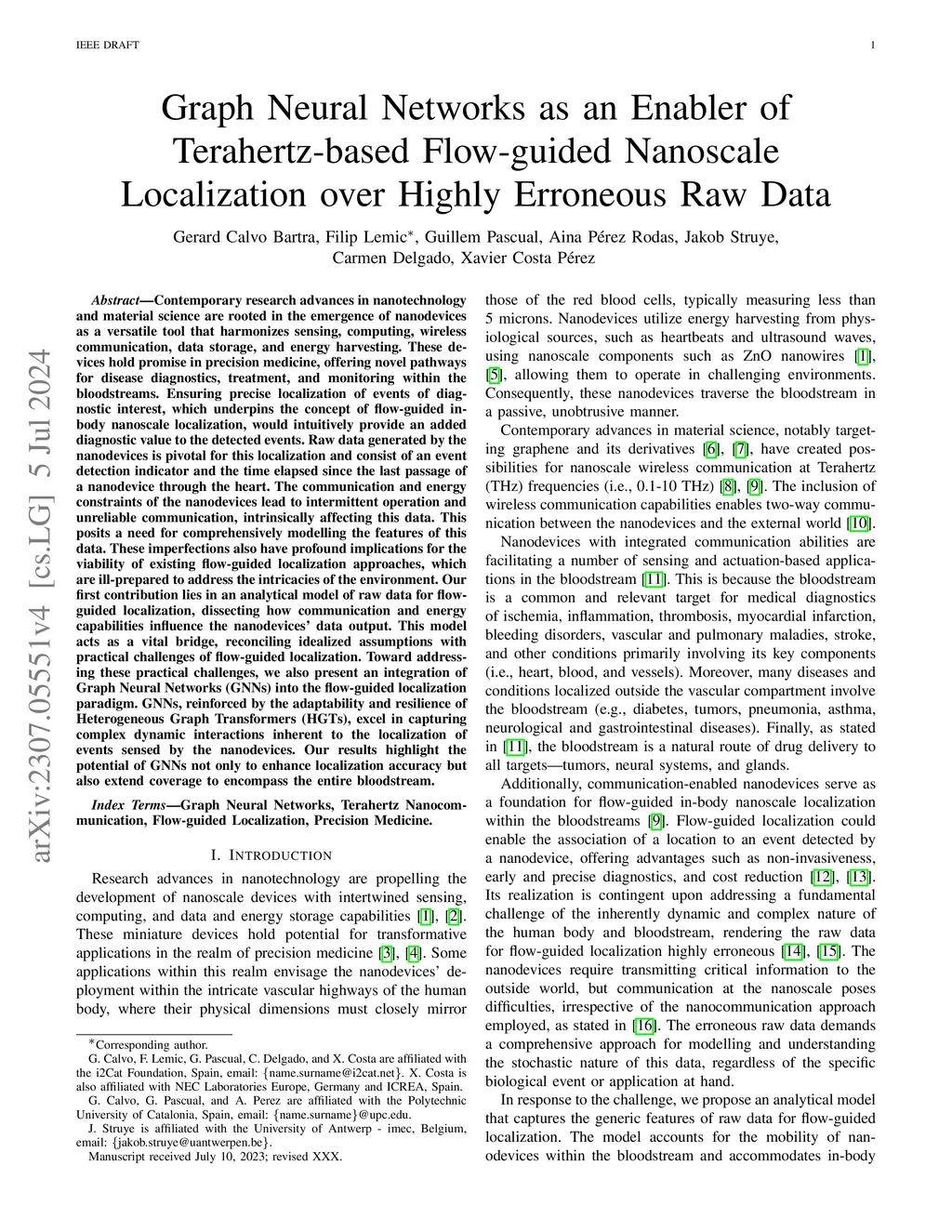 Contemporary research advances in nanotechnology and material science are rooted in the emergence of nanodevices as a versatile tool that harmonizes sensing, computing, wireless communication, data storage, and energy harvesting. These devices offer novel pathways for disease diagnostics, treatment, and monitoring within the bloodstreams. Ensuring precise localization of events of diagnostic interest, which underpins the concept of flow-guided in-body nanoscale localization, would provide an added diagnostic value to the detected events. Raw data generated by the nanodevices is pivotal for this localization and consist of an event detection indicator and the time elapsed since the last passage of a nanodevice through the heart. The energy constraints of the nanodevices lead to intermittent operation and unreliable communication, intrinsically affecting this data. This posits a need for comprehensively modelling the features of this data. These imperfections also have profound implications for the viability of existing flow-guided localization approaches, which are ill-prepared to address the intricacies of the environment. Our first contribution lies in an analytical model of raw data for flow-guided localization, dissecting how communication and energy capabilities influence the nanodevices' data output. This model acts as a vital bridge, reconciling idealized assumptions with practical challenges of flow-guided localization. Toward addressing these practical challenges, we also present an integration of Graph Neural Networks (GNNs) into the flow-guided localization paradigm. GNNs excel in capturing complex dynamic interactions inherent to the localization of events sensed by the nanodevices. Our results highlight the potential of GNNs not only to enhance localization accuracy but also extend coverage to encompass the entire bloodstream.