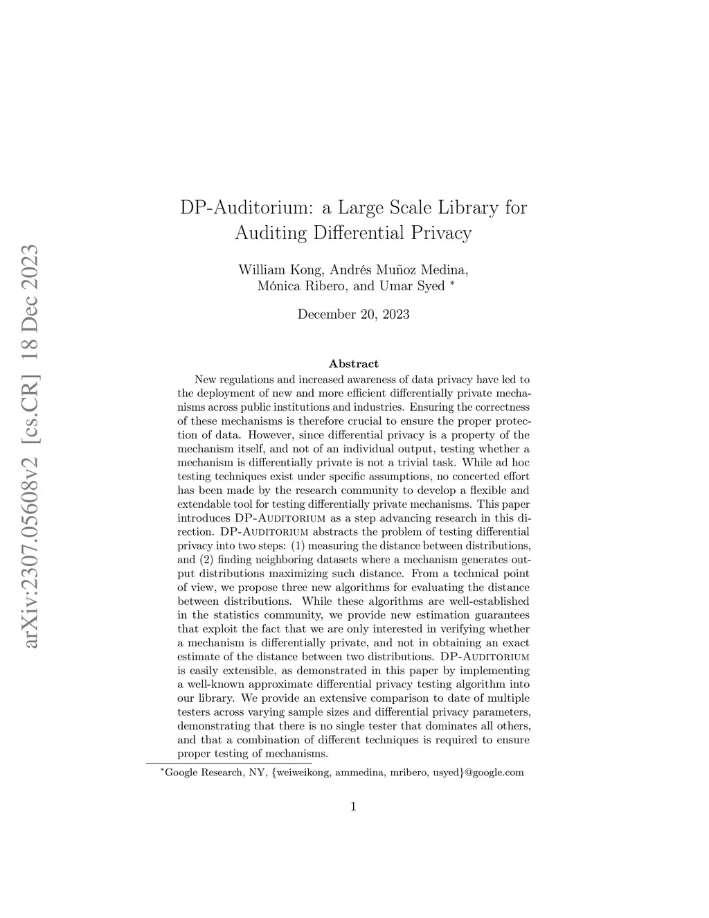 New regulations and increased awareness of data privacy have led to the deployment of new and more efficient differentially private mechanisms across public institutions and industries. Ensuring the correctness of these mechanisms is therefore crucial to ensure the proper protection of data. However, since differential privacy is a property of the mechanism itself, and not of an individual output, testing whether a mechanism is differentially private is not a trivial task. While ad hoc testing techniques exist under specific assumptions, no concerted effort has been made by the research community to develop a flexible and extendable tool for testing differentially private mechanisms. This paper introduces DP-Auditorium as a step advancing research in this direction. DP-Auditorium abstracts the problem of testing differential privacy into two steps: (1) measuring the distance between distributions, and (2) finding neighboring datasets where a mechanism generates output distributions maximizing such distance. From a technical point of view, we propose three new algorithms for evaluating the distance between distributions. While these algorithms are well-established in the statistics community, we provide new estimation guarantees that exploit the fact that we are only interested in verifying whether a mechanism is differentially private, and not in obtaining an exact estimate of the distance between two distributions. DP-Auditorium is easily extensible, as demonstrated in this paper by implementing a well-known approximate differential privacy testing algorithm into our library. We provide an extensive comparison to date of multiple testers across varying sample sizes and differential privacy parameters, demonstrating that there is no single tester that dominates all others, and that a combination of different techniques is required to ensure proper testing of mechanisms.