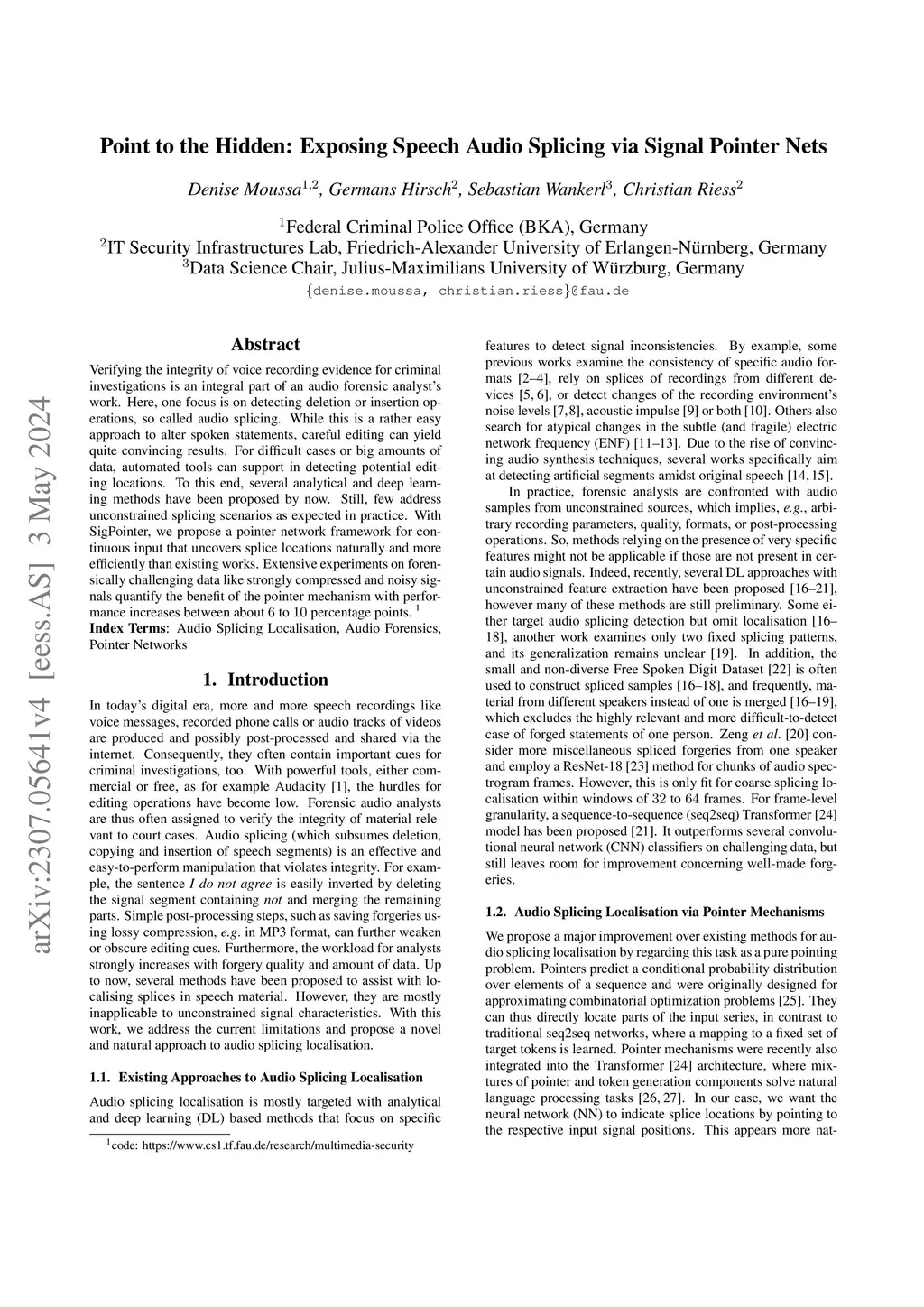 Verifying the integrity of voice recording evidence for criminal investigations is an integral part of an audio forensic analyst's work. Here, one focus is on detecting deletion or insertion operations, so called audio splicing. While this is a rather easy approach to alter spoken statements, careful editing can yield quite convincing results. For difficult cases or big amounts of data, automated tools can support in detecting potential editing locations. To this end, several analytical and deep learning methods have been proposed by now. Still, few address unconstrained splicing scenarios as expected in practice. With SigPointer, we propose a pointer network framework for continuous input that uncovers splice locations naturally and more efficiently than existing works. Extensive experiments on forensically challenging data like strongly compressed and noisy signals quantify the benefit of the pointer mechanism with performance increases between about 6 to 10 percentage points.