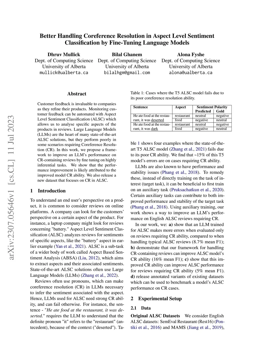 Customer feedback is invaluable to companies as they refine their products. Monitoring customer feedback can be automated with Aspect Level Sentiment Classification (ALSC) which allows us to analyse specific aspects of the products in reviews. Large Language Models (LLMs) are the heart of many state-of-the-art ALSC solutions, but they perform poorly in some scenarios requiring Coreference Resolution (CR). In this work, we propose a framework to improve an LLM's performance on CR-containing reviews by fine tuning on highly inferential tasks. We show that the performance improvement is likely attributed to the improved model CR ability. We also release a new dataset that focuses on CR in ALSC.