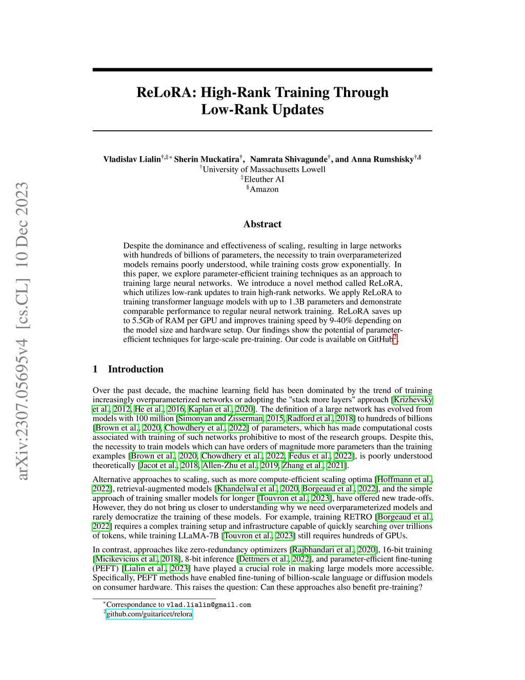Despite the dominance and effectiveness of scaling, resulting in large networks with hundreds of billions of parameters, the necessity to train overparameterized models remains poorly understood, while training costs grow exponentially. In this paper, we explore parameter-efficient training techniques as an approach to training large neural networks. We introduce a novel method called ReLoRA, which utilizes low-rank updates to train high-rank networks. We apply ReLoRA to training transformer language models with up to 1.3B parameters and demonstrate comparable performance to regular neural network training. ReLoRA saves up to 5.5Gb of RAM per GPU and improves training speed by 9-40% depending on the model size and hardware setup. Our findings show the potential of parameter-efficient techniques for large-scale pre-training.