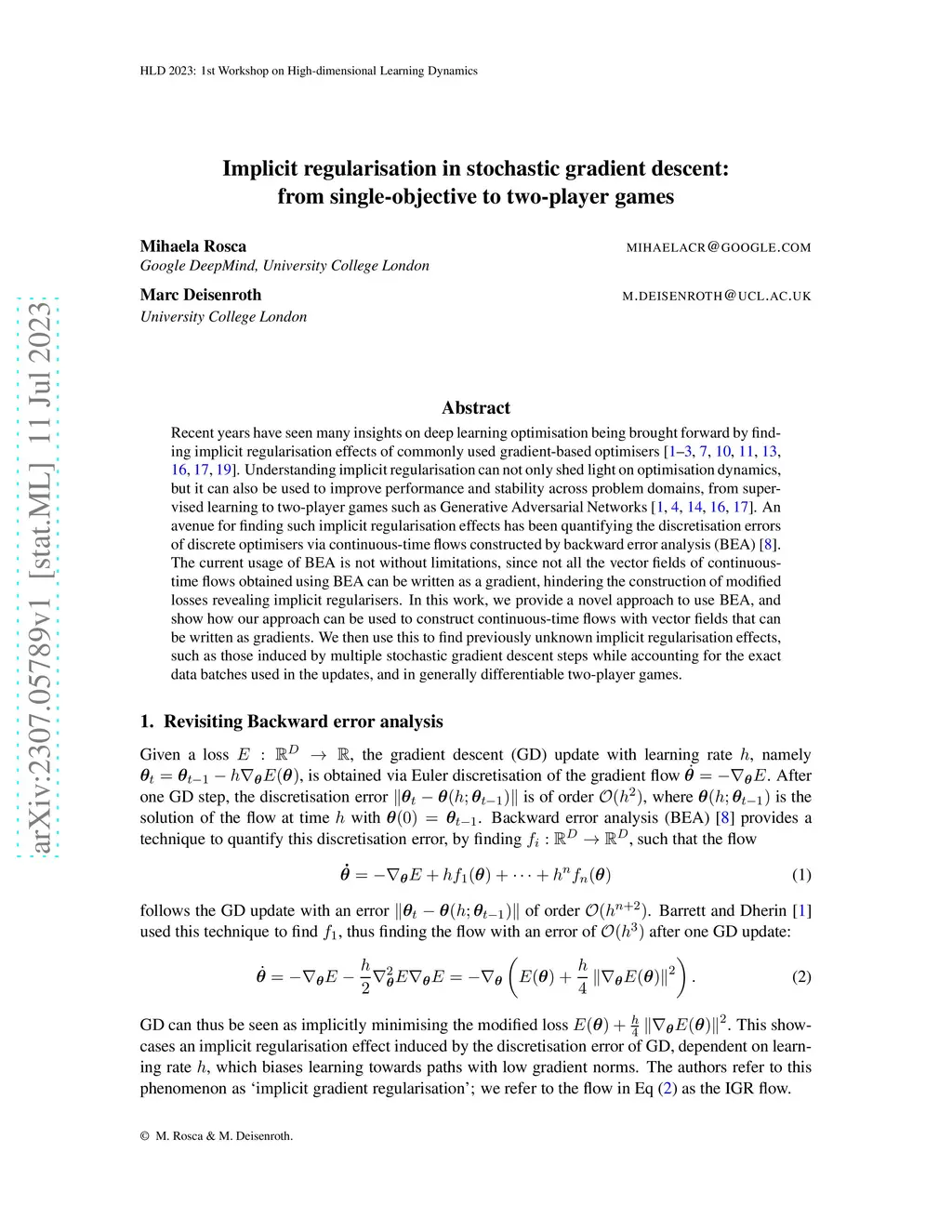 Recent years have seen many insights on deep learning optimisation being brought forward by finding implicit regularisation effects of commonly used gradient-based optimisers. Understanding implicit regularisation can not only shed light on optimisation dynamics, but it can also be used to improve performance and stability across problem domains, from supervised learning to two-player games such as Generative Adversarial Networks. An avenue for finding such implicit regularisation effects has been quantifying the discretisation errors of discrete optimisers via continuous-time flows constructed by backward error analysis (BEA). The current usage of BEA is not without limitations, since not all the vector fields of continuous-time flows obtained using BEA can be written as a gradient, hindering the construction of modified losses revealing implicit regularisers. In this work, we provide a novel approach to use BEA, and show how our approach can be used to construct continuous-time flows with vector fields that can be written as gradients. We then use this to find previously unknown implicit regularisation effects, such as those induced by multiple stochastic gradient descent steps while accounting for the exact data batches used in the updates, and in generally differentiable two-player games.