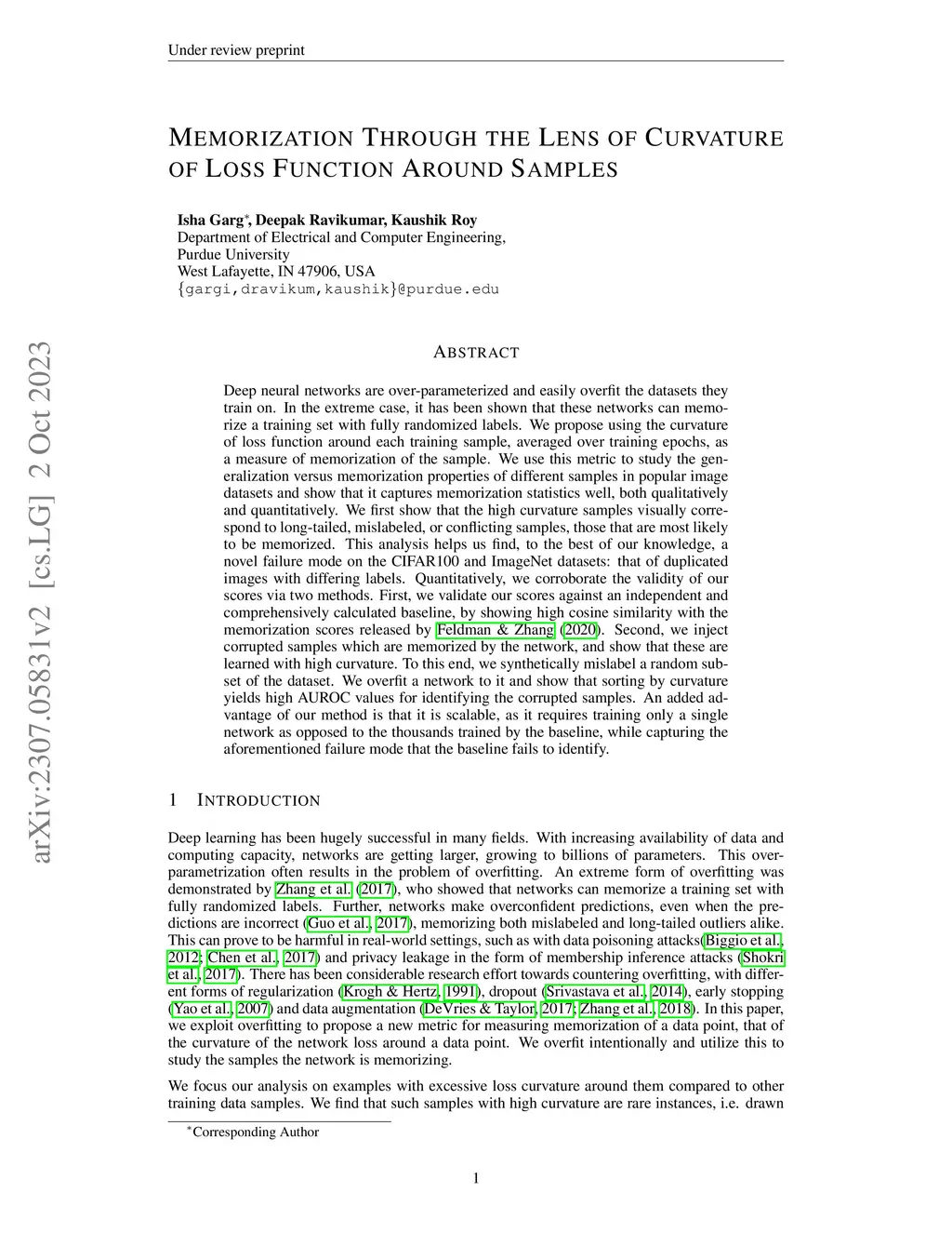 Neural networks are overparametrized and easily overfit the datasets they train on. In the extreme case, it is shown that they can memorize a training set with fully randomized labels. We propose using the curvature of loss function around the training sample as a measure of its memorization, averaged over all training epochs. We use this to study the generalization versus memorization properties of different samples in popular image datasets. We visualize samples with the highest curvature of loss around them, and show that these visually correspond to long-tailed, mislabeled or conflicting samples. This analysis helps us find a, to the best of our knowledge, novel failure model on the CIFAR100 dataset, that of duplicated images with different labels. We also synthetically mislabel a proportion of the dataset by randomly corrupting the labels of a few samples, and show that sorting by curvature yields high AUROC values for identifying the mislabeled samples.