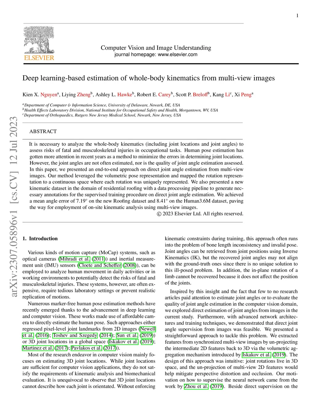 It is necessary to analyze the whole-body kinematics (including joint locations and joint angles) to assess risks of fatal and musculoskeletal injuries in occupational tasks. Human pose estimation has gotten more attention in recent years as a method to minimize the errors in determining joint locations. However, the joint angles are not often estimated, nor is the quality of joint angle estimation assessed. In this paper, we presented an end-to-end approach on direct joint angle estimation from multi-view images. Our method leveraged the volumetric pose representation and mapped the rotation representation to a continuous space where each rotation was uniquely represented. We also presented a new kinematic dataset in the domain of residential roofing with a data processing pipeline to generate necessary annotations for the supervised training procedure on direct joint angle estimation. We achieved a mean angle error of on the new Roofing dataset and on the Human3.6M dataset, paving the way for employment of on-site kinematic analysis using multi-view images.