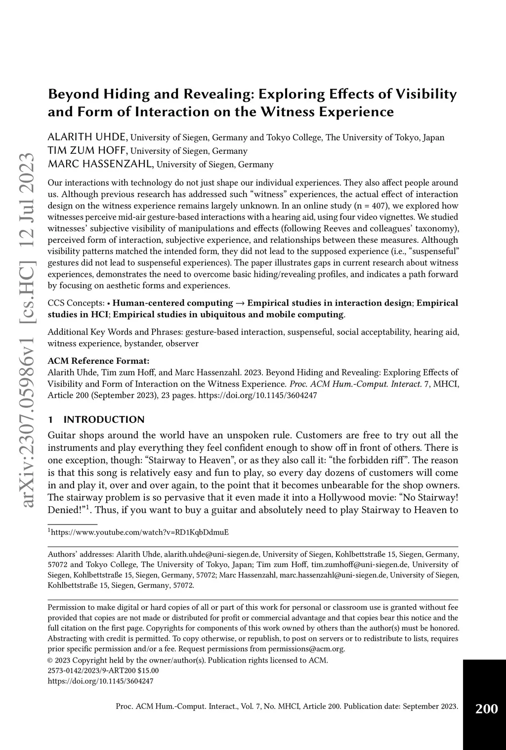 Our interactions with technology do not just shape our individual experiences. They also affect people around us. Although previous research has addressed such "witness" experiences, the actual effect of interaction design on the witness experience remains largely unknown. In an online study (n = 407), we explored how witnesses perceive mid-air gesture-based interactions with a hearing aid, using four video vignettes. We studied witnesses' subjective visibility of manipulations and effects (following Reeves and colleagues' taxonomy), perceived form of interaction, subjective experience, and relationships between these measures. Although visibility patterns matched the intended form, they did not lead to the supposed experience (i.e., "suspenseful" gestures did not lead to suspenseful experiences). The paper illustrates gaps in current research about witness experiences, demonstrates the need to overcome basic hiding/revealing profiles, and indicates a path forward by focusing on aesthetic forms and experiences.